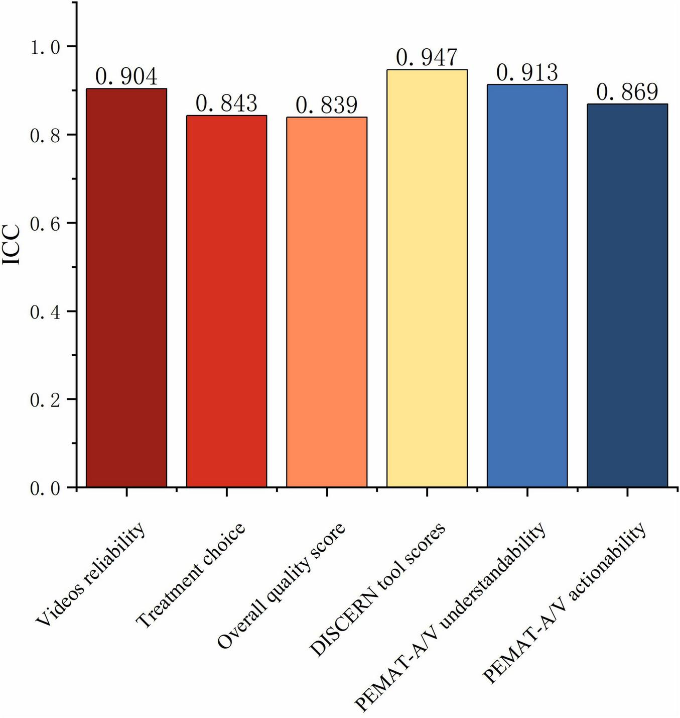 Inter-rater agreement for video quality assessments. ICCs between two independent raters are shown for Reliability, Treatment choice, DISCERN total score, Overall quality score, PEMAT-A/V Understandability, and PEMAT-A/V Actionability.