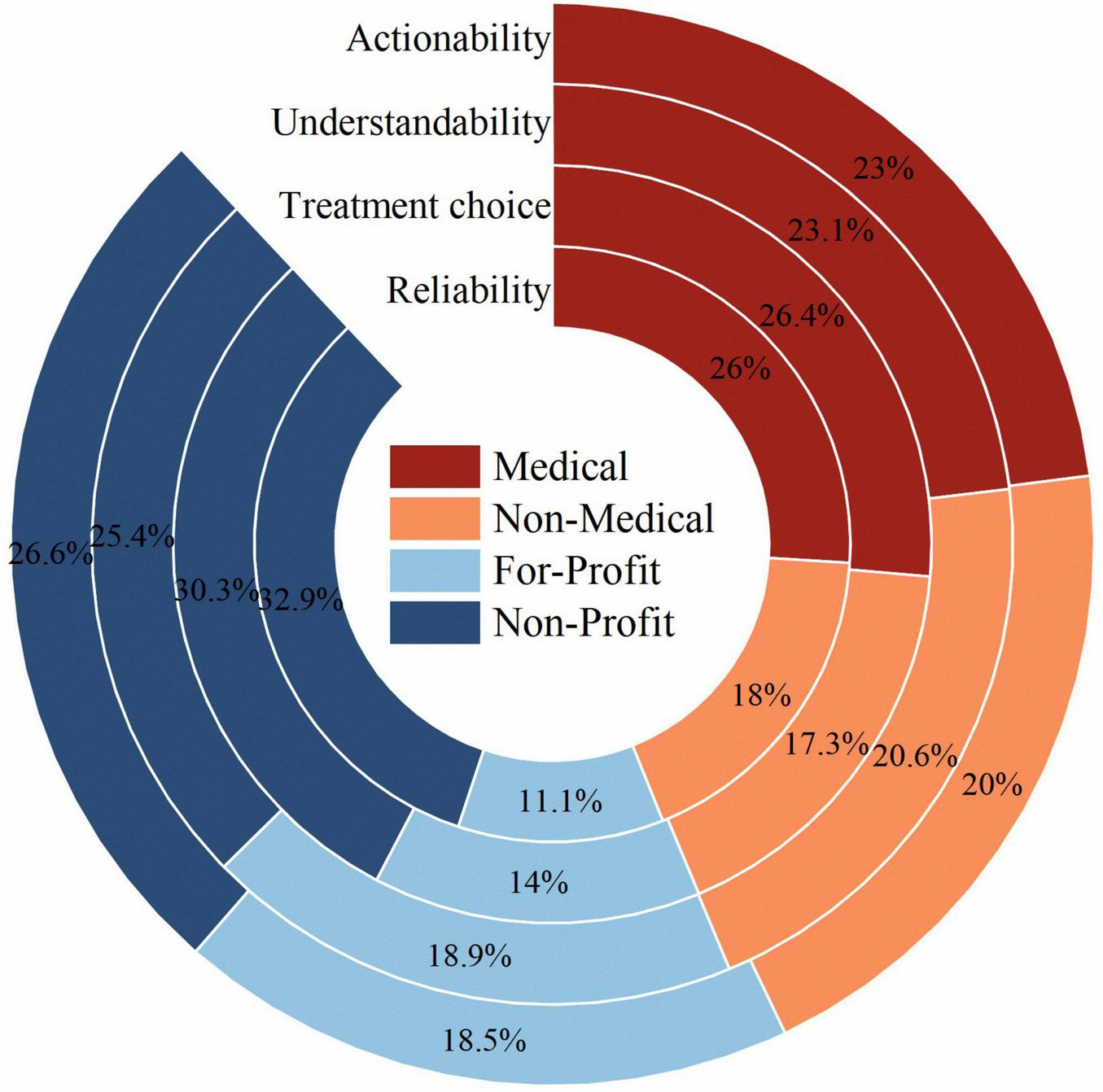 Regarding the proportion of Reliability scores, the Non-Profit and Medical groups accounted for 32.9 and 26.0%, respectively, whereas the Non-Medical and For-Profit groups contributed less, at only 18 and 11.1%. For Treatment choice, Non-Profit and Medical groups accounted for 30.3 and 26.4%, whereas Non-Medical and For-Profit groups accounted for only 17.3 and 14.0%. For Understandability, the Non-Profit and Medical groups contributed 25.4 and 23.1%, whereas the Non-Medical and For-Profit groups contributed only 20.6 and 18.9%. For Actionability, the Non-Profit and Medical groups accounted for 26.6 and 23.0%, while the Non-Medical and For-Profit groups contributed only 20.0 and 18.5%. Across these four dimensions, the Non-Profit and Medical groups consistently achieved higher performance levels (Figure 6).