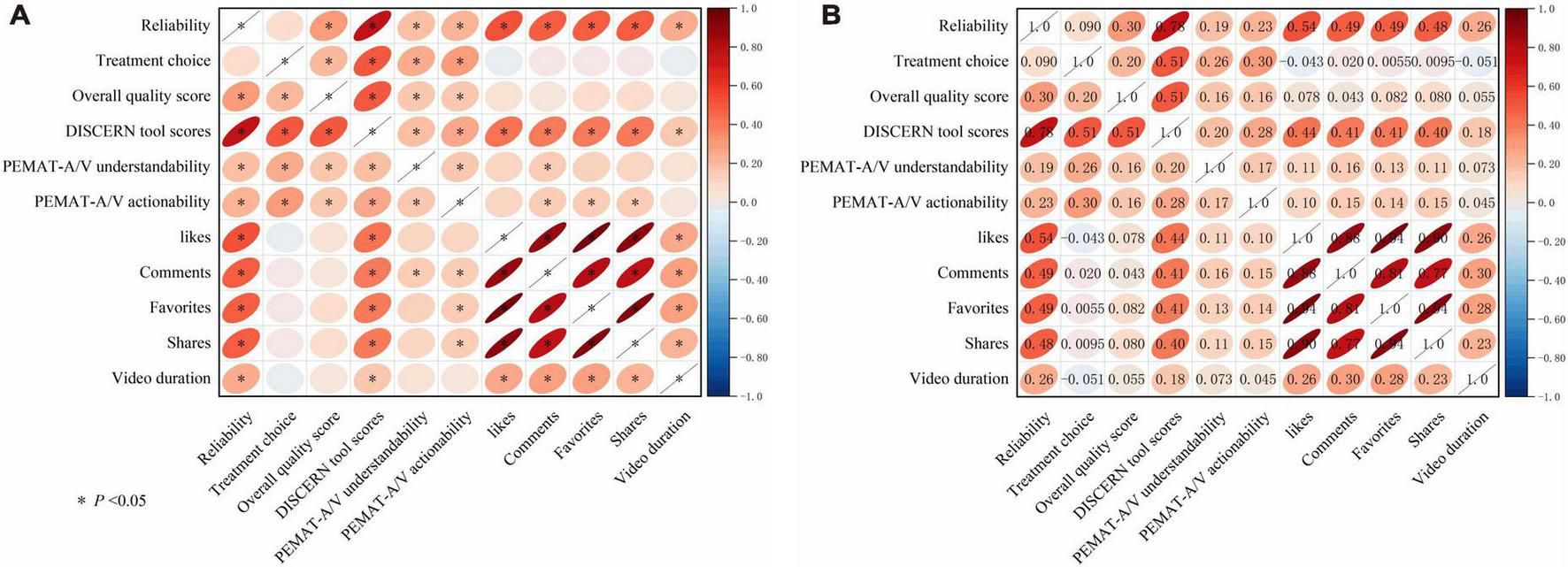 Video quality was evaluated using two validated tools: The DISCERN instrument, which consists of 16 questions, is designed to assess the quality of consumer health information regarding treatment options and is considered the gold standard for evaluating the reliability of health information. Each question is rated on a 5-point scale, with a total score ranging from 16 to 80, where higher scores indicate better quality (23, 24). The Patient Education Materials Assessment Tool for Audiovisual Materials (PEMAT-A/V) consists of 17 items divided into two domains: Understandability and Actionability, rated as “agree,” “disagree,” or “not applicable” (25, 26). Prior to the formal evaluation, all raters received standardized training. A random sample of 20 videos was selected for a pilot evaluation to ensure inter-rater reliability, and the intraclass correlation coefficient (ICC) among raters was subsequently calculated.