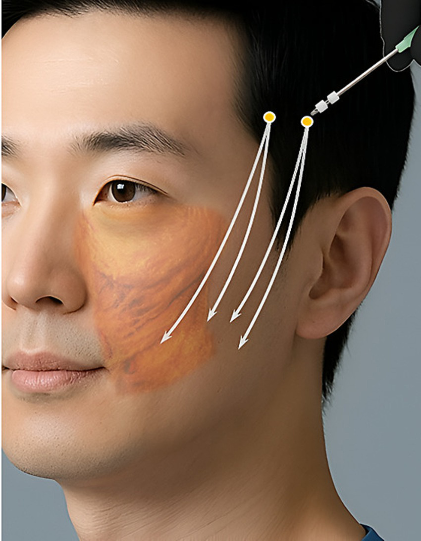 The thread pathways at the lateral face are used in the present study. Based on one entry point, three cannulas of 19-G with thread (N-Fix, N-Finders, Seoul, Korea) were inserted towards the mouth corner. Three cannulas were generally targeted to reach deep portion of the subcutaneous layer which might be considered the supraSMAS layer. Created using Gemini (Imagen 3) (https://gemini.google.com/).