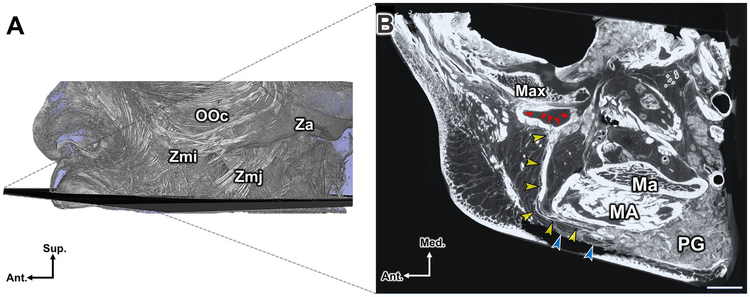 Micro-CT image showing the SMAS layer and its connections with the platysma and zygomaticus major and minor muscles. The image was taken at the level of the nasal ala. The red, orange, and yellow arrowheads indicate the platysma, SMAS, and zygomaticus major and minor muscles, respectively. Note that the platysma and SMAS cover the parotid gland (PG) and part of the masseter muscle (MA), with limited space between the SMAS, PG, and MA. Scale bar: 1 cm; Ma, mandible; Max, maxilla; Lat., lateral; Med., medial; Ant., anterior; Post., posterior.