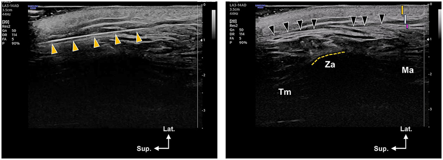 Ultrasonography images showing the location of the thread within the lateral face. The left image indicates the cannula’s location at the temple area, which was taken at the level of the lateral canthus. The yellow arrowheads point to the thread’s position within the temporoparietal or superficial temporal fascia. The right image displays the thread’s location within the subcutaneous layer (indicated by black arrowheads, which refer to the supra-SMAS in this article), specifically the deep portion of the subcutaneous layer just superficial to the SMAS layer. This image was taken at the zygomatic arch (ZA) level. In the upper right corner of the right image, the orange, white, and pink bars represent the skin, subcutaneous, and SMAS layers, respectively. Tm, Temporalis muscle; Ma, masseter muscle; Lat., lateral, Sup., superior.