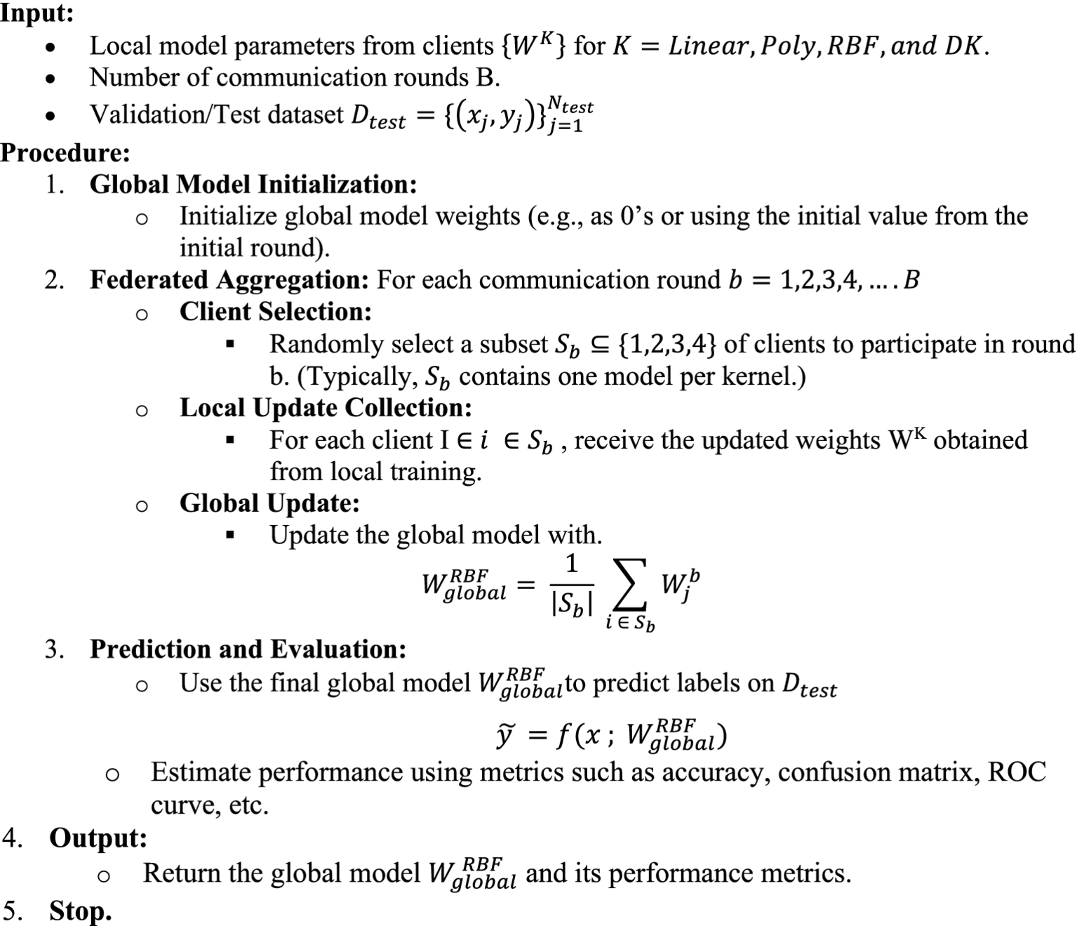 Proposed Global Model Aggregation attain 98.4% accuracy and strong generalization across diverse patient demographics by combining client-side kernel models into a global RBF-based classifier.