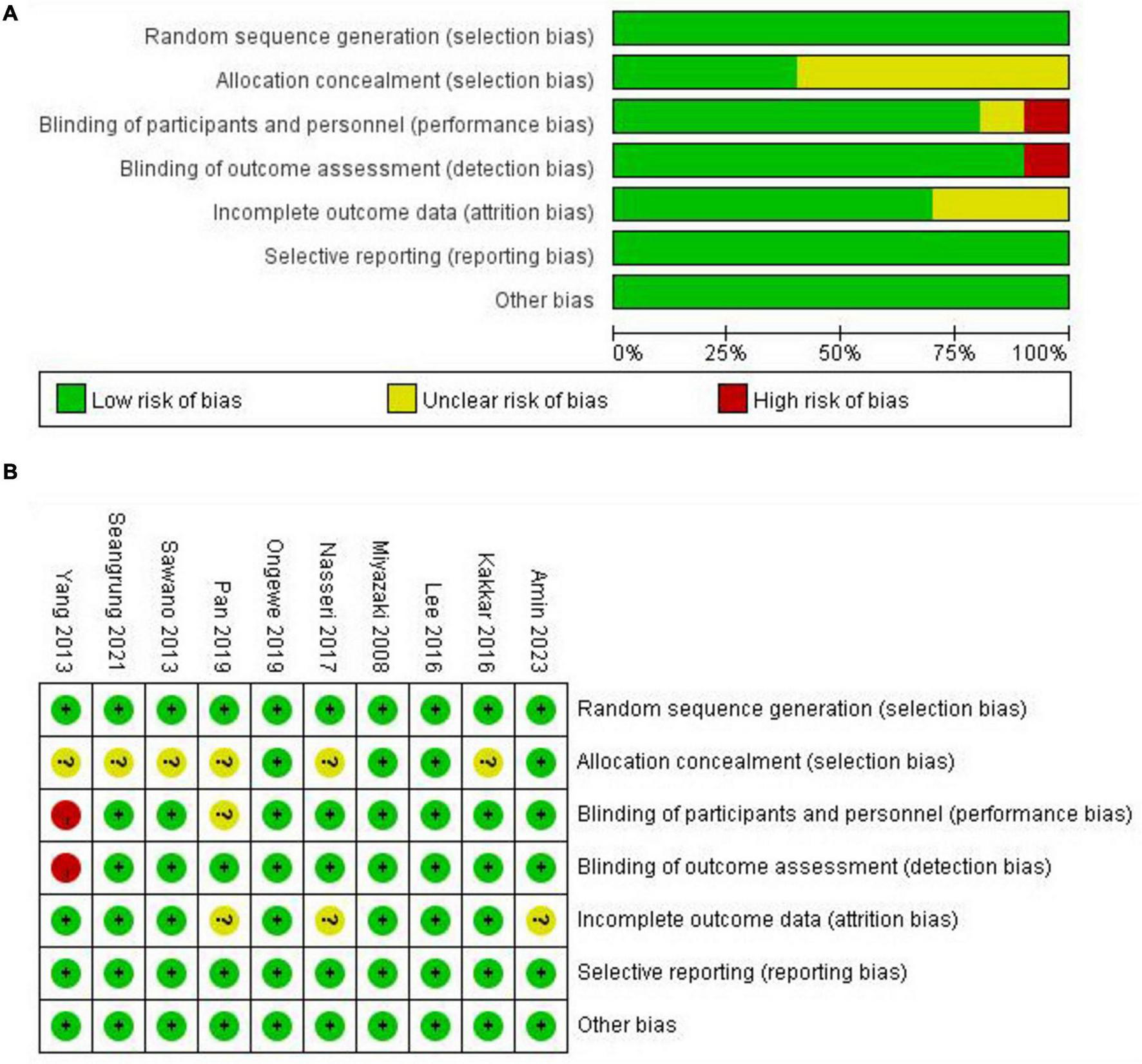 Cochrane Collaboration’s risk of bias assessment. (A) Risk of bias graph representing the assessment of each risk of bias item, presented as percentages within all included studies. (B) Risk of bias summary for each included studies.