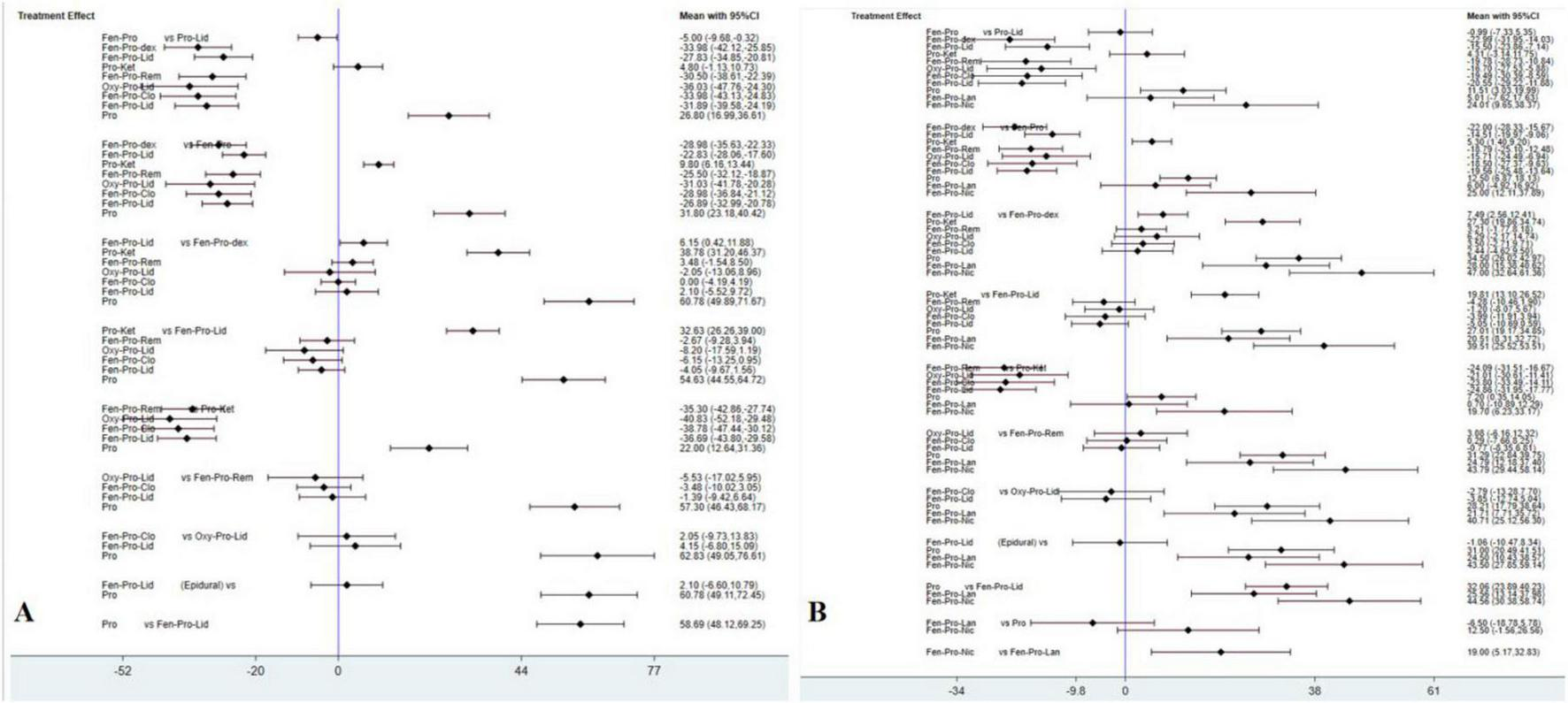 The comparison of ΔMAP of each strategy obtained from NMA is presented in Figure 4A, where Oxycodone-Propofol-Lidocaine (Oxy-Pro-Lid) showed lowest ΔMAP compared to the other nine pharmacological strategies. The rankogram and cumulative ranking plot (Supplementary Figure 3A) showed that Oxy-Pro-Lid had the lowest ΔMAP. The top three SUCRA rankings are: Oxy-Pro-Lid (87.4%), Fen-Pro-Dex (82.9%), and Fentanyl-Propofol-Clonidine (Fen-Pro-Clo) (81.6%). The SUCRA results revealed that Oxy-Pro-Lid was the top-ranked pharmacological strategy for mitigating mean arterial pressure fluctuations after intubation.