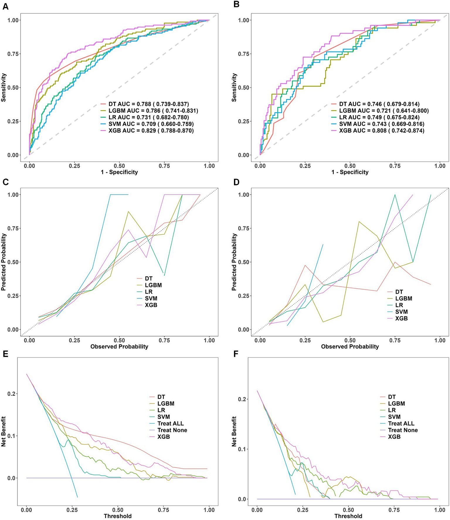 Patients were randomly allocated to the training and validation sets in a 7:3 ratio. All data preprocessing procedures, including missing data imputation, feature selection, variable scaling, and hyperparameter tuning, were performed exclusively within the training set. The parameters derived from the training set were subsequently applied to the validation set without re-estimation. The validation set was used only for final model performance evaluation. In the training set, initial predictor selection was performed using least absolute shrinkage and selection operator (LASSO) regression implemented in the glmnet package in R. Predictors retained by LASSO were subsequently entered into a logistic regression model to estimate adjusted associations and to control for potential confounding. The final predictor set identified through the logistic regression was then used to develop a suite of machine-learning algorithms, including logistic regression (LR), a decision tree (DT), support vector machine (SVM), Light Gradient Boosting Machine (LightGBM), and Extreme Gradient Boosting (XGBoost). These algorithms were selected because of their strong performance on structured clinical data; their complementary modeling mechanisms and differing approaches to feature handling were expected to increase the diversity and robustness of model performance. Model discrimination was primarily assessed by the area under the receiver operating characteristic (ROC) curve (AUC). To provide a more complete assessment of classification performance, we also calculated accuracy, sensitivity (recall), and the F1 score. Differences in AUC between models were assessed using DeLong’s test for correlated ROC curves. Bootstrap-based internal validation (500 resamples) was applied to evaluate model discrimination and calibration. After selecting the optimal model, we applied SHAP analyses, including summary, dependence, and force plots, to examine model behavior at both global and individual (local) levels and thereby enhance interpretability.