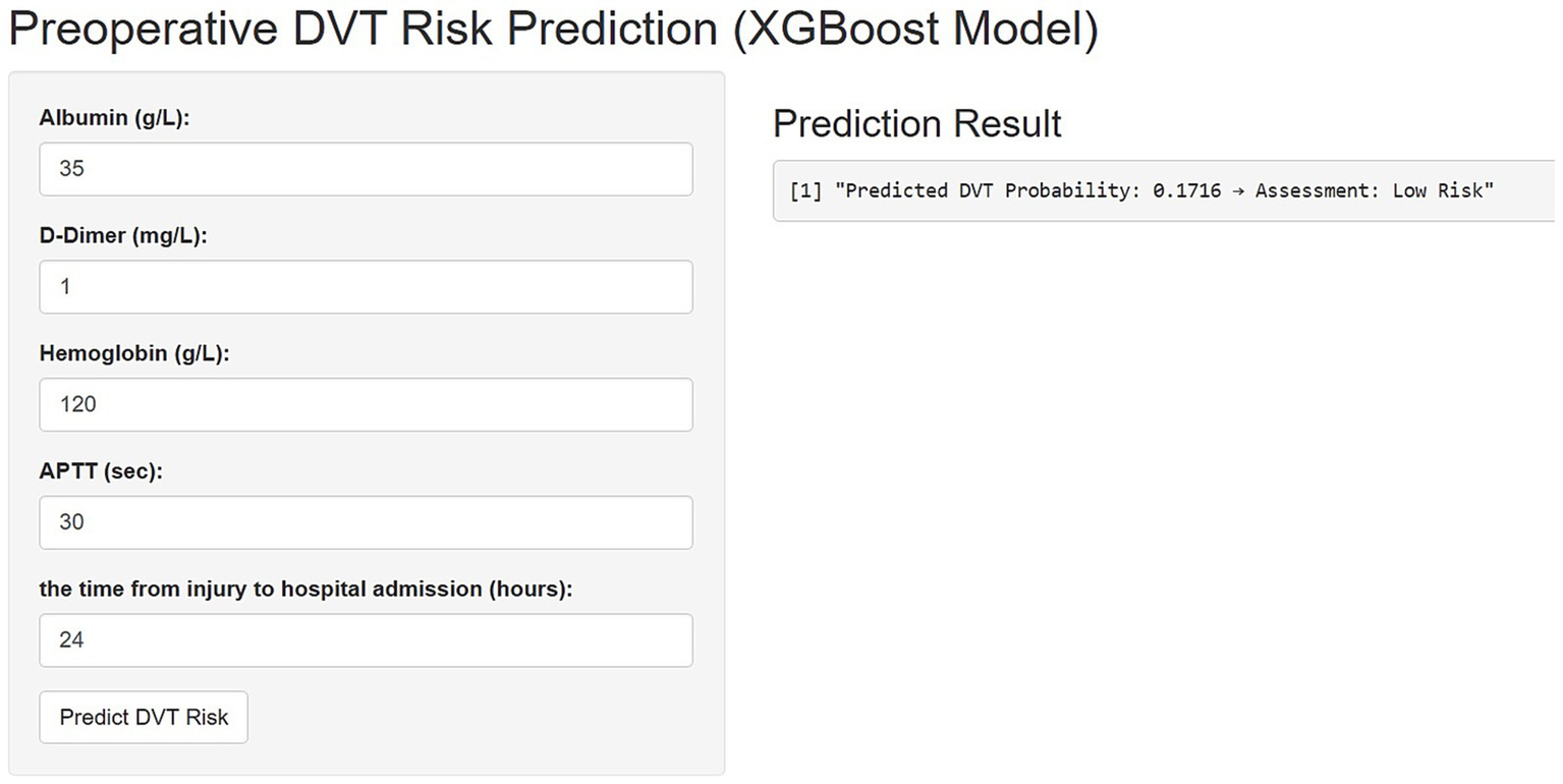 In recent years, machine learning techniques have increasingly been applied to predict postoperative or perioperative DVT in surgical populations. These studies underscore the growing clinical relevance of machine learning for DVT risk stratification in surgical and orthopedic settings (11, 12). Recent advances in artificial intelligence (AI) have rapidly expanded applications in biomedicine, offering novel approaches to address complex clinical problems (13). Machine learning (ML) models have demonstrated strong predictive performance across a broad spectrum of diseases and clinical outcomes (14). Interpretability methods, such as SHAP, provide actionable insights into model behavior, enhancing transparency and facilitating clinical translation (15). In this retrospective study, we developed and validated an interpretable machine-learning model to predict preoperative DVT risk in older adults with hip fractures, providing a clinically applicable tool for individualized risk stratification. Using routinely collected preoperative clinical and laboratory variables, we developed several predictive algorithms and found that Extreme Gradient Boosting (XGBoost) showed the best performance. To improve transparency, we used SHAP for model interpretability and deployed the final model as a web-based calculator to support real-time, individualized risk assessment within routine clinical workflows.