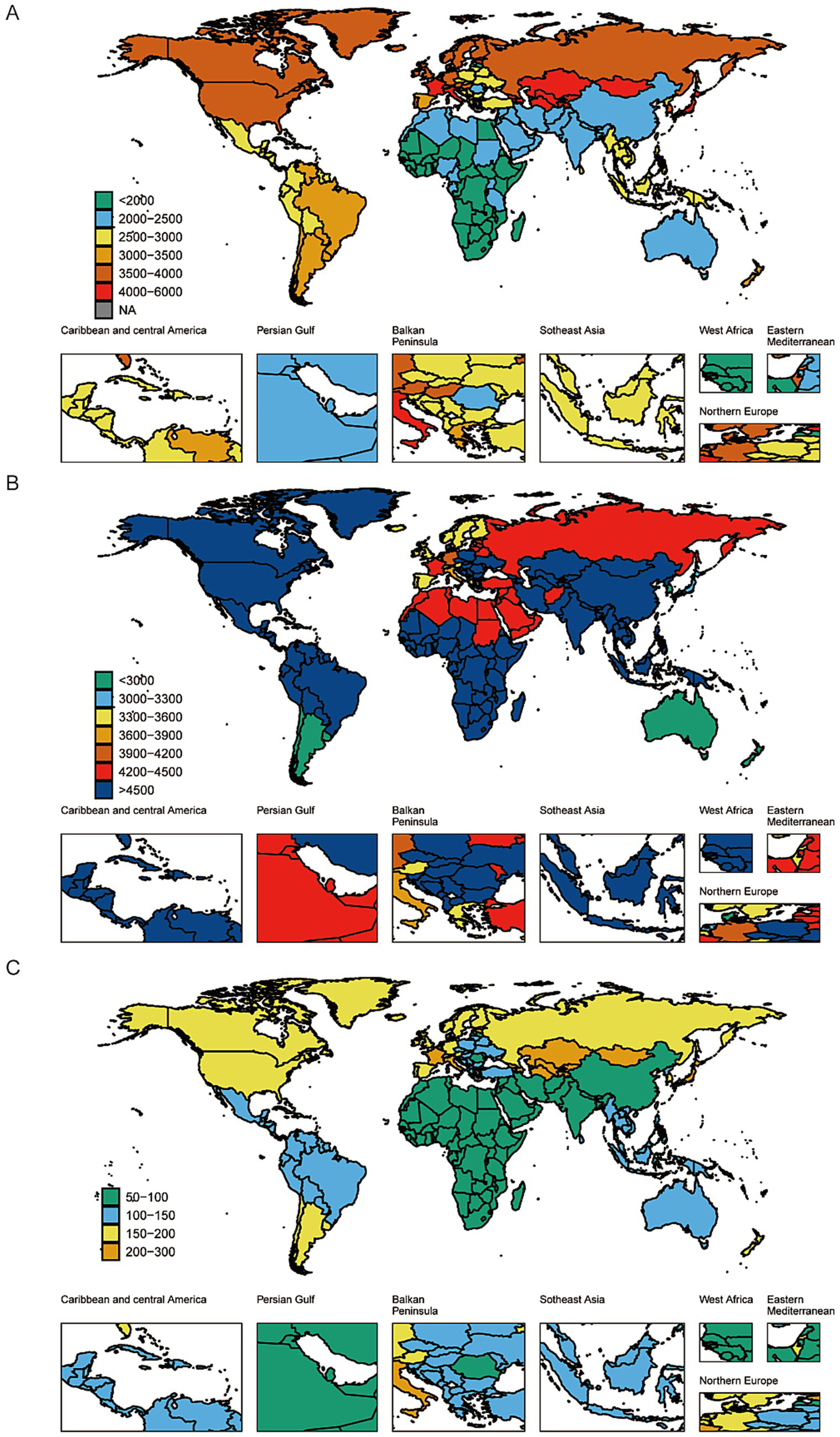 The global disease burden of dermatitis for both sexes in 204 countries and territories: (A) prevalence rate, (B) incidence rate, (C) DALYs rate.