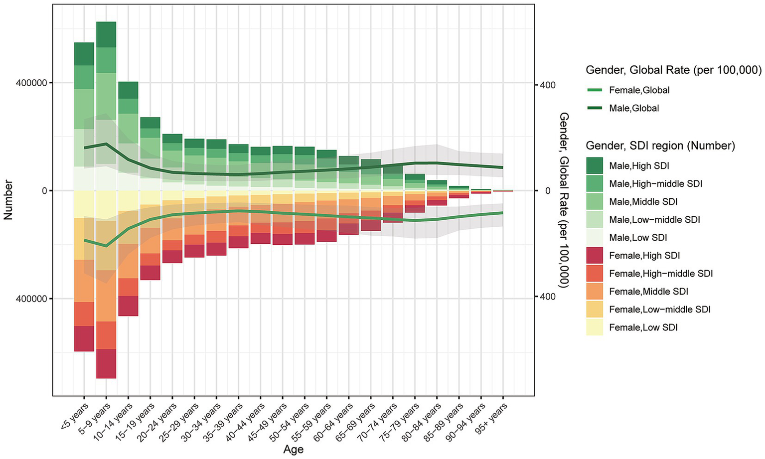 In 2021, the burden of dermatitis varied markedly across sex, age groups, and SDI regions. Overall, the majority of cases were concentrated among children and adolescents, particularly in the <5 to 14-year age groups, with the number of cases gradually declining with increasing age. Across all age groups, males consistently exhibited a higher number of cases than females, with the most pronounced sex difference observed in the 15–44-year age group. A similar pattern was observed in the ASIR, which was generally higher in males than in females, especially between the ages of 20 and 44 years.