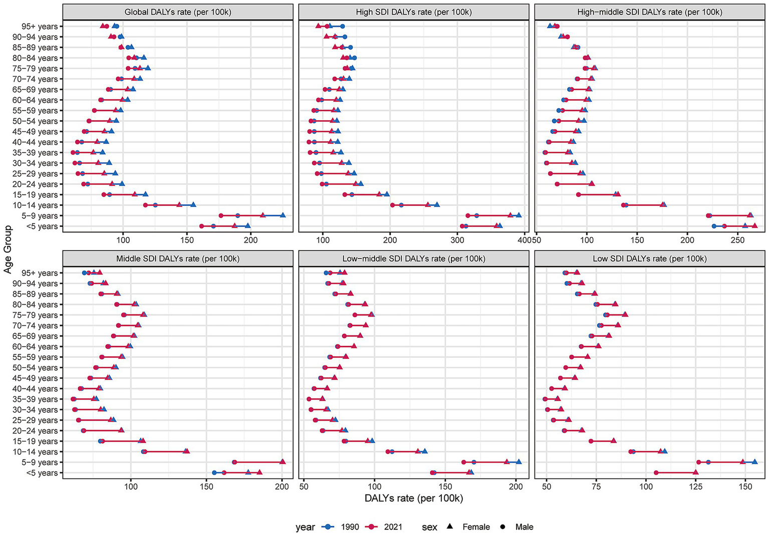 In 2021, the DALYs rate due to dermatitis showed marked disparities across SDI regions and age groups. Overall, the DALYs rate increased with age, peaking in individuals aged 85 years and older, indicating a greater health burden among the elderly. Substantial differences were observed across SDI regions: high-SDI areas maintained consistently low DALYs rates across all ages, reflecting stronger capabilities in dermatitis prevention and treatment. In contrast, middle-high and middle-SDI regions exhibited moderate DALYs rates, while low-middle and low-SDI regions had generally higher rates, especially among individuals aged over 60 years. Notably, DALYs rates among children aged 0–4 years were relatively similar across SDI categories, suggesting a globally shared risk of early childhood dermatitis. However, age-related divergence widened with increasing age. ASIR remained relatively stable, predominantly affecting individuals aged 15–64 years, with higher burden observed in low and low-middle SDI regions, and minimal sex differences. In contrast, ASPR increased across all age groups, particularly in middle and low-middle SDI countries, likely due to longer survival and improved disease management leading to cumulative prevalence. ASDR also rose with age, with the most severe health loss seen in those aged ≥65 years, especially in middle and low-middle SDI regions. Although high-SDI countries have maintained better control over all burden indicators, the overall trend highlights a continued global increase in dermatitis-related burden—particularly in low- and middle-income countries—underscoring the urgent need for early intervention and enhanced health resource allocation. Collectively, the burden of dermatitis tends to escalate with advancing age and decreasing SDI level, underscoring global disparities in dermatological care and resource distribution (Figure 6; Supplementary Figure S4).