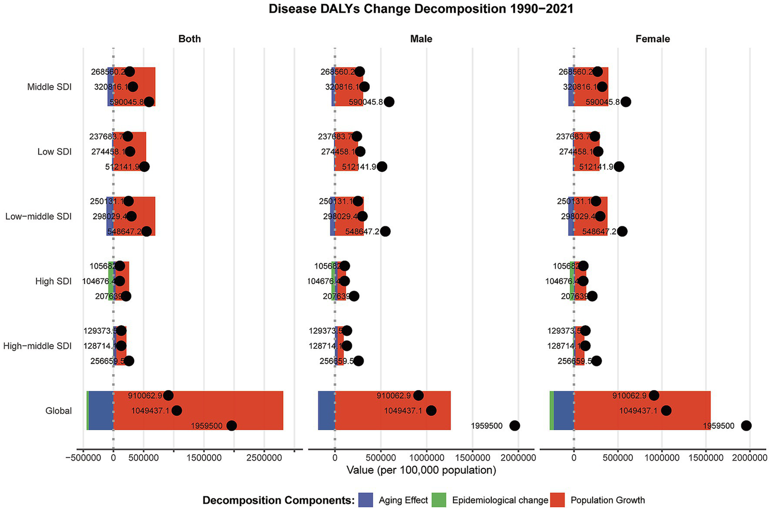 Decomposition analysis is a valuable statistical method in epidemiology and public health that helps identify and quantify the contributions of various drivers to changes in disease burden over time (19). To identify key factors influencing DALY changes from 1990 to 2021, we applied decomposition analysis to disentangle the effects of population growth, population aging, and epidemiological changes.