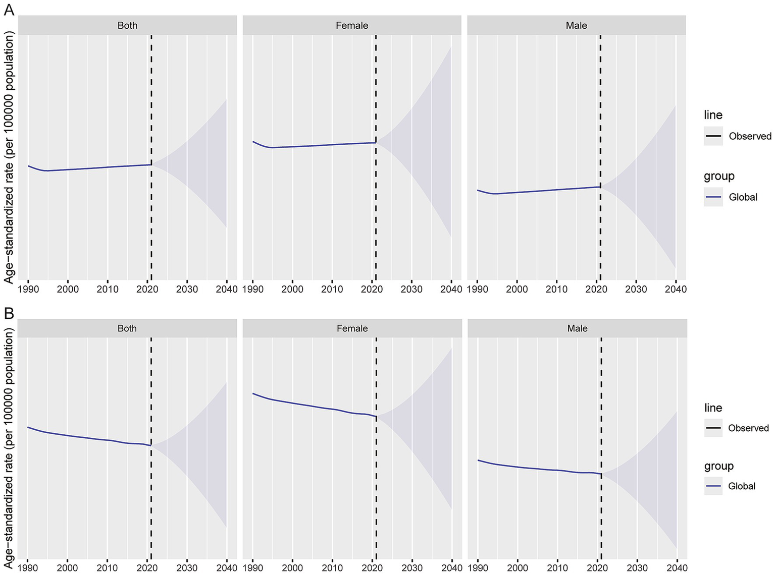 Data from the Global Burden of Disease Study 2021 (GBD 2021) included prevalence, incidence, disability-adjusted life years (DALYs), and age-standardized rates (ASRs), stratified by year, region, age, and Sociodemographic Index (SDI). Analyses used estimated annual percentage change (EAPC), inequality indices, decomposition, and Bayesian age-period-cohort (BAPC) modeling for forecasting.