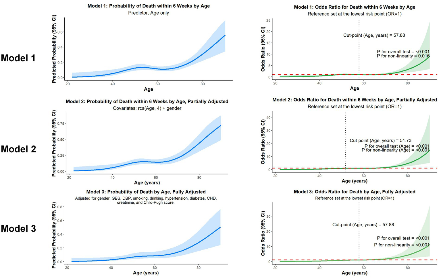 Missing data for covariates were handled using multiple imputation with five imputations. Continuous variables were presented as the median and interquartile range (IQR) and compared using the Mann–Whitney U test or Kruskal-Wallis test, as appropriate. Categorical variables were reported as frequencies and percentages (%) and compared using the Chi-square test or Fisher’s exact test. To model the association between age and 6-week mortality, we constructed three sequential logistic regression models, with age entered as a continuous variable: Model 1, a univariable model, assessed the crude association between age (as a continuous variable) and the primary outcome. Model 2 was adjusted for gender to account for fundamental demographic confounding. Model 3 was the fully adjusted multivariable model, which included the variables from Model 2 plus a comprehensive set of clinically relevant covariates. These were selected to control for disease severity, baseline hemodynamics, lifestyle factors, and major comorbidities, and included the GBS, systolic and diastolic blood pressure on admission, smoking history, alcohol consumption, hypertension, diabetes, coronary heart disease, BUN, and creatinine (Cr). Candidate variables for this model were selected based on clinical importance and statistical significance (p < 0.10) in univariable analyses. The final model was determined using a backward stepwise selection algorithm. Within each model, we employed restricted cubic splines (RCS) with four knots to flexibly model and visualize the potential non-linear dose–response relationship. The age at which the odds ratio (OR) for mortality crossed from below to above 1.0 was identified as the critical risk threshold. Subgroup analyses were performed to evaluate the consistency of the age-mortality association across various clinical strata, including Child-Pugh grade, GBS and etiology of liver cirrhosis. Furthermore, a formal test for interaction was conducted by including a multiplicative interaction term (e.g., age × ICU-admission) in the multivariable logistic regression model. All statistical tests were two-sided with p values < 0.05 considered statistically significant. Analyses were performed using R software, version 4.2.1 (R Foundation for Statistical Computing, Vienna, Austria).