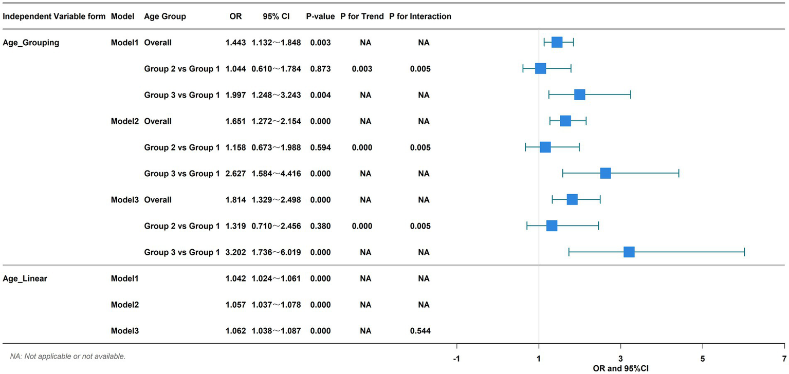 When all patients were stratified by age into tertiles, significant differences in baseline characteristics and outcomes were observed (Table 1). There were 309 patients in Group 1 with a median age of 47 years; 278 in Group 2 with a median age of 58 years; and 291 in Group 3 with a median age of 68 years. The 6-week mortality rate rose progressively with age, from 10.03% in the youngest group (Group 1) to 10.43% in the middle group (Group 2), and peaked at 18.21% in the oldest group (Group 3, P for trend < 0.001). Patients in the oldest group (Group 3) had a significantly higher prevalence of comorbidities, including hypertension and coronary heart disease, but paradoxically had lower rates of prior smoking and alcohol consumption. Additionally, they had lower rates of portal vein thrombosis (PVT) and liver failure. There was a notable demographic shift characterized by a decreasing proportion of male patients as age increased. Importantly, there were no significant differences among the groups in terms of presenting bleeding symptoms, need for ICU admission, or baseline albumin, Hb, Cr, and TnI levels. In contrast, the oldest group (Group 3) had the lowest levels of TB, PT, ALT, AST and INR, but the highest levels of PLT, BUN, CK-MB, and myoglobin among the three groups.