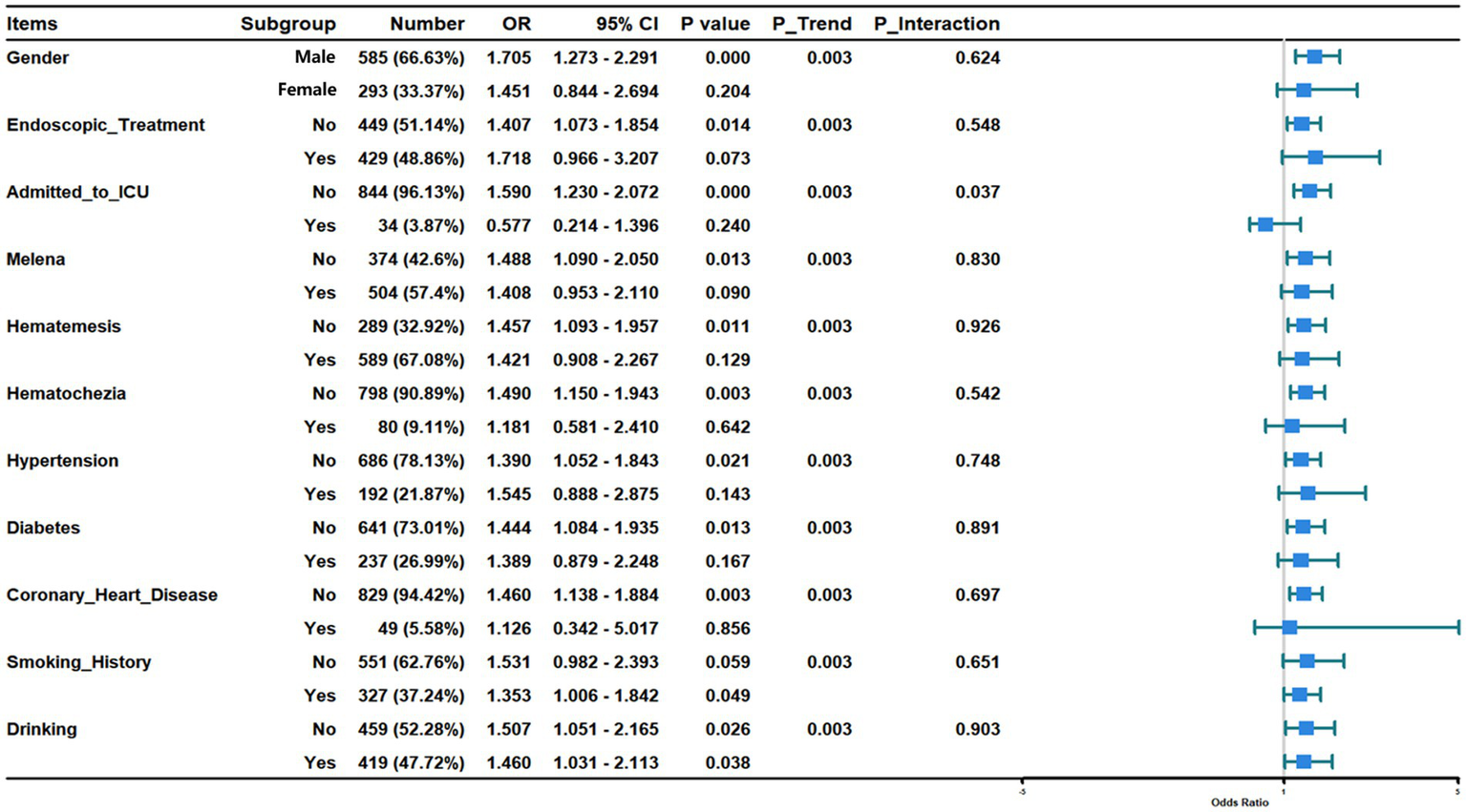 To understand if the prognostic effect of age was consistent across different patient subsets, we performed extensive subgroup analyses (Figure 5). In male patients, age was associated with 6-week mortality (OR, 1.705; 95%CI, 1.273–2.291; p < 0.001), but no association between age and 6-week mortality existed in female patients. For patients who did not receive endoscopic treatment, age was associated with 6-week mortality (OR, 1.407; 95%CI, 1.073–1.854; p = 0.014), but there was no association between age and 6-week mortality in patients who received endoscopic treatment. Age was associated with 6-week mortality in patients without symptoms of melena (OR, 1.488; 95%CI, 1.090–2.050; p = 0.003), hematemesis (OR, 1.457; 95%CI, 1.093–1.957; p = 0.003) and hematochezia (OR, 1.490; 95%CI, 1.150–1.943; p = 0.003). In patients with these symptoms, however, there was no relationship between age and 6-week mortality. Regarding comorbidities, age was associated with 6-week mortality in patients without hypertension (OR, 1.390; 95%CI, 1.052–1.843; p = 0.021), diabetes (OR, 1.444; 95%CI, 1.084–1.935; p = 0.003) and coronary heart disease (OR, 1.460; 95%CI, 1.138–1.884; p = 0.003), but in patients with hypertension, diabetes and coronary heart disease, age was not associated with 6-week mortality. In patients with history of smoking, age was associated with 6-week mortality (OR, 1.353; 95%CI, 1.006–1.842; p = 0.049), however, age was not associated with 6-week mortality in patients who did not smoke. Age was associated with 6-week mortality regardless of history of alcohol consumption (OR, 1.460; 95%CI, 1.031–2.113; p = 0.038; OR, 1.507; 95%CI, 1.051–2.165; p = 0.026). In all the above subgroups, the P for interaction was greater than 0.05, indicating that gender, endoscopic treatment, melena, hematemesis, hematochezia, hypertension, diabetes, coronary heart disease, smoking history, and alcohol consumption did not significantly modify the effect of age on mortality.