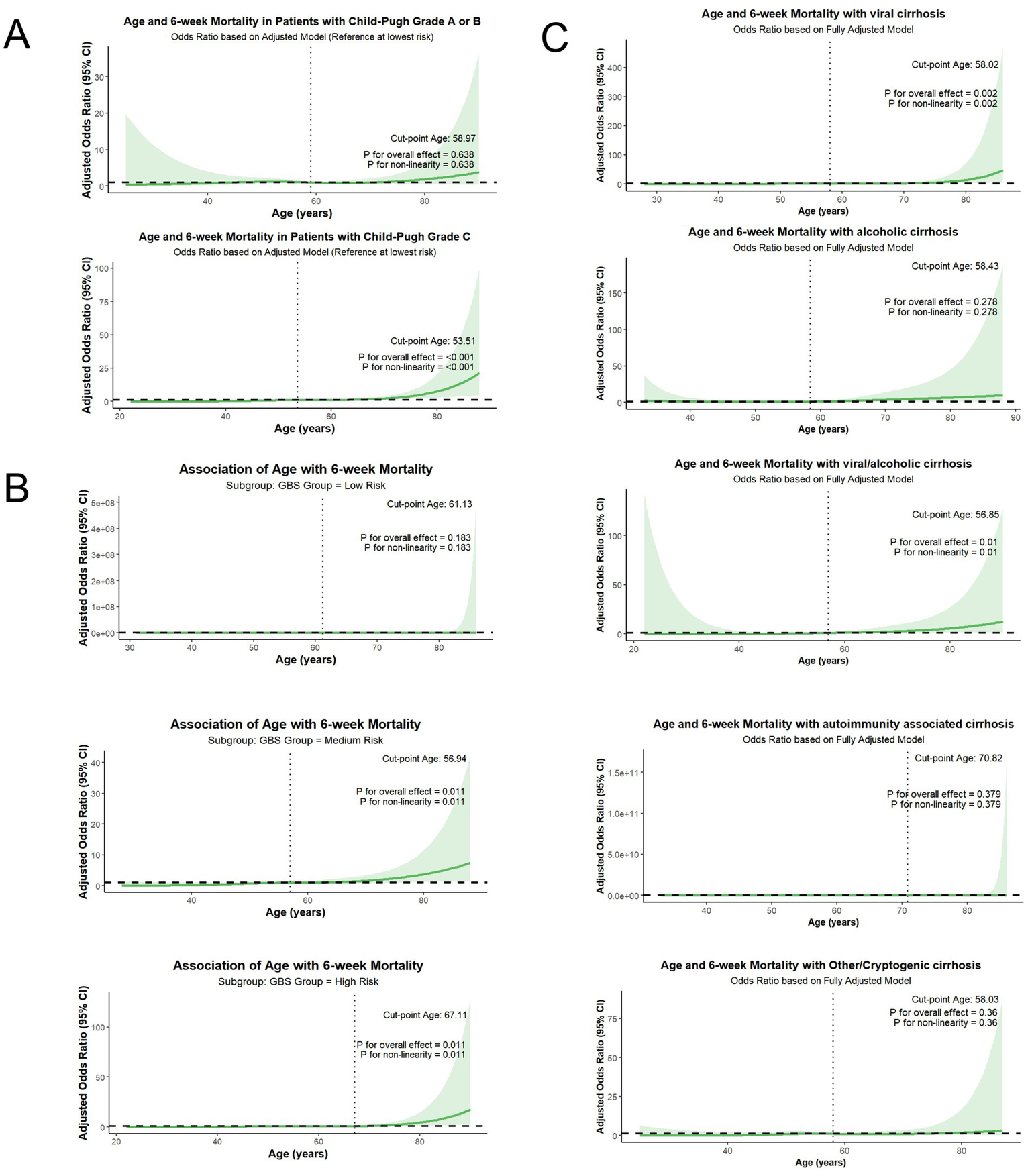 Subgroup analysis of the association between age and 6-week mortality based on Child-Pugh grade, GBS and etiology of liver cirrhosis. (A) analysis of the association between age and 6-week mortality based on Child-Pugh grade; (B) analysis of the association between age and 6-week mortality based on GBS; (C) analysis of the association between age and 6-week mortality based on etiology of liver cirrhosis.