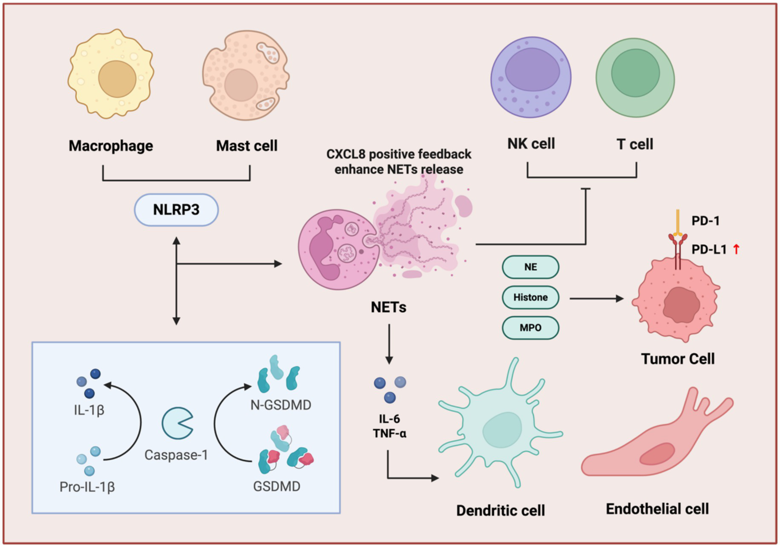 Immune cell regulatory network of NETs. NETs amplify immunosuppression through inflammasome activation, cytokine feedback, and immune checkpoint dysregulation. NET components, NE, histone, and MPO stimulate macrophages and mast cells to activate the NLRP3 inflammasome, triggering GSDMD into N-GSDMD and maturation of IL-1β. This cascade enhances NET release via a CXCL8-positive feedback loop. Concurrently, NETs induce pro-inflammatory cytokines (IL-6, TNF-α) and upregulate PD-L1 on tumor cells, promoting T cell and NK cell exhaustion through PD-1/PD-L1 interactions. Dendritic and endothelial cells further contribute to this immunosuppressive microenvironment, facilitating tumor immune evasion.