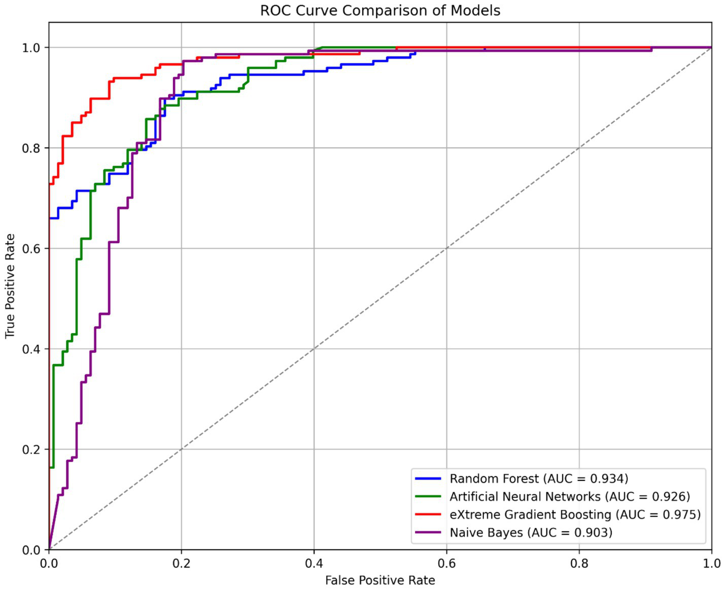 XGBoost demonstrated superior performance in the cross-validation findings, achieving accuracy and AUROC scores of 91.10 and 98.60%, respectively. ANN (90.32%; 96.80%) and RF (83.75%; 93.58%) rank subsequent to the XGBoost model, respectively. NB ranked last, exhibiting the lowest accuracy and AUROC with 67.67 and 90.00%, respectively.
