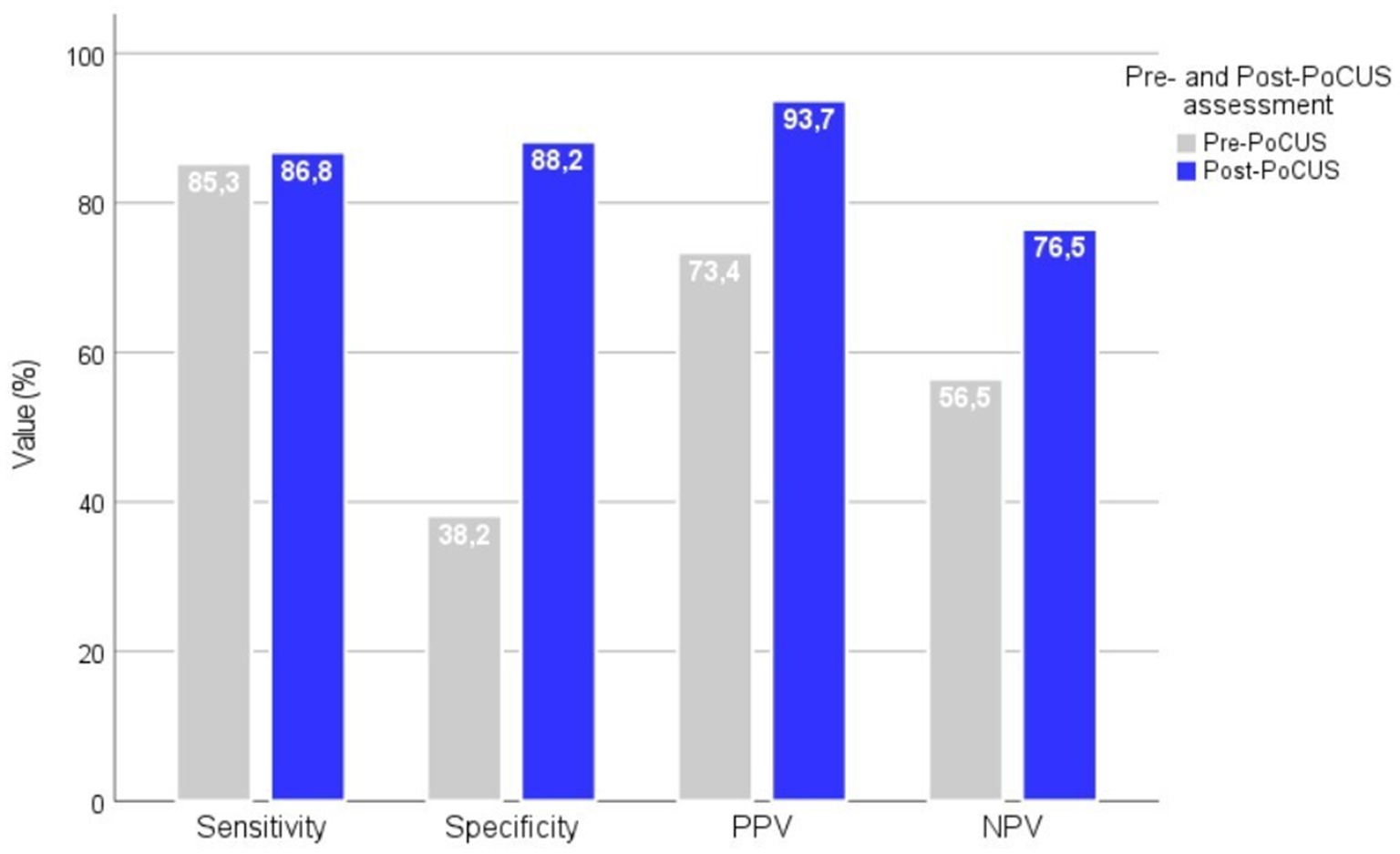 Diagnostic performance metrics before and after PoCUS assessment by GPs. Diagnostic performance metrics (sensitivity, specificity, PPV, and NPV) of GPs before and after the implementation of PoCUS in the diagnostic workflow. The application of PoCUS significantly improved all diagnostic parameters. PPV, positive predictive value; NPV, negative predictive value.