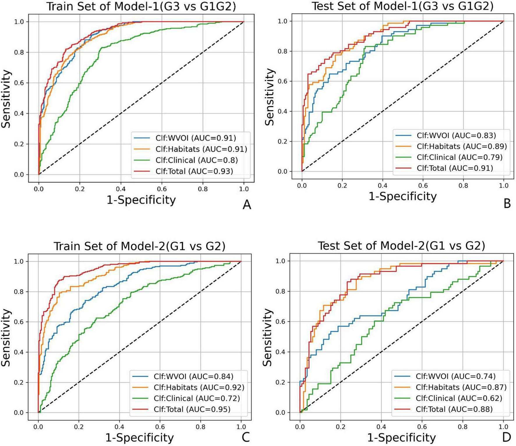 In both Model-1 and Model-2, the classification performance of Clf Habitats was generally superior to that of Clf WVOI and Clf Clinical, achieving an AUC of 0.89 and 0.87, specificity of 0.73 for both models, and BACC of 0.78 and 0.79, respectively, on the test set. The combined model, Clf Total, achieved the best predictive performance on the test set, with AUC values of 0.91 and 0.88, specificity of 0.84 and 0.77, and BACC of 0.82 and 0.81.