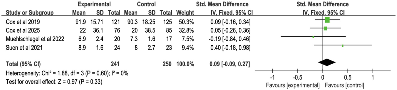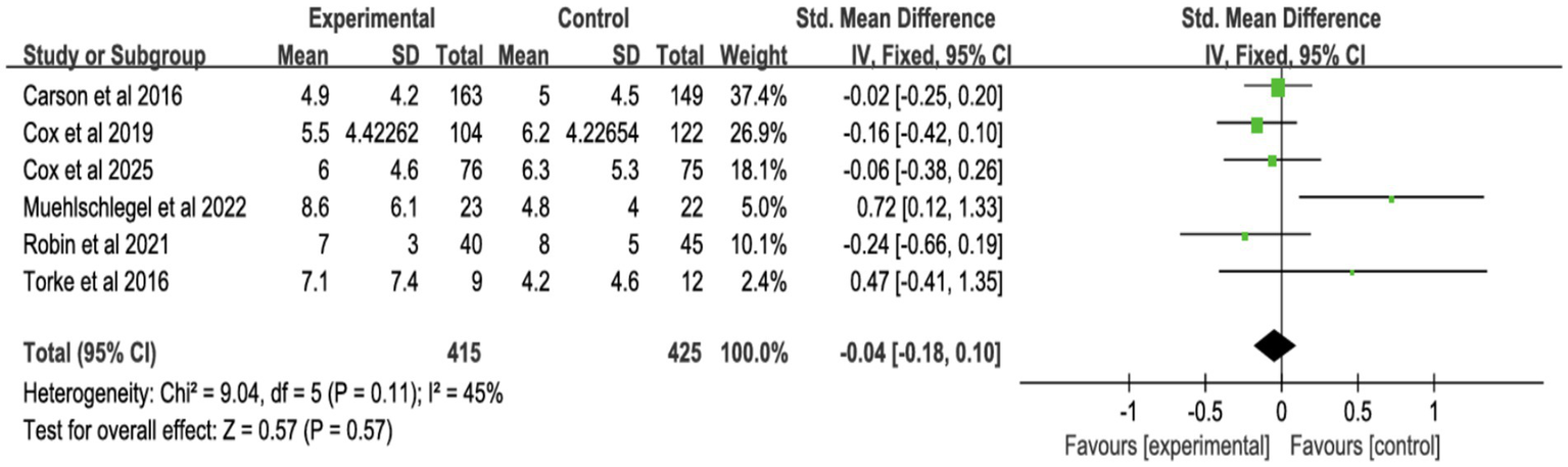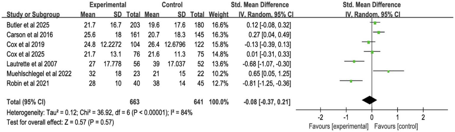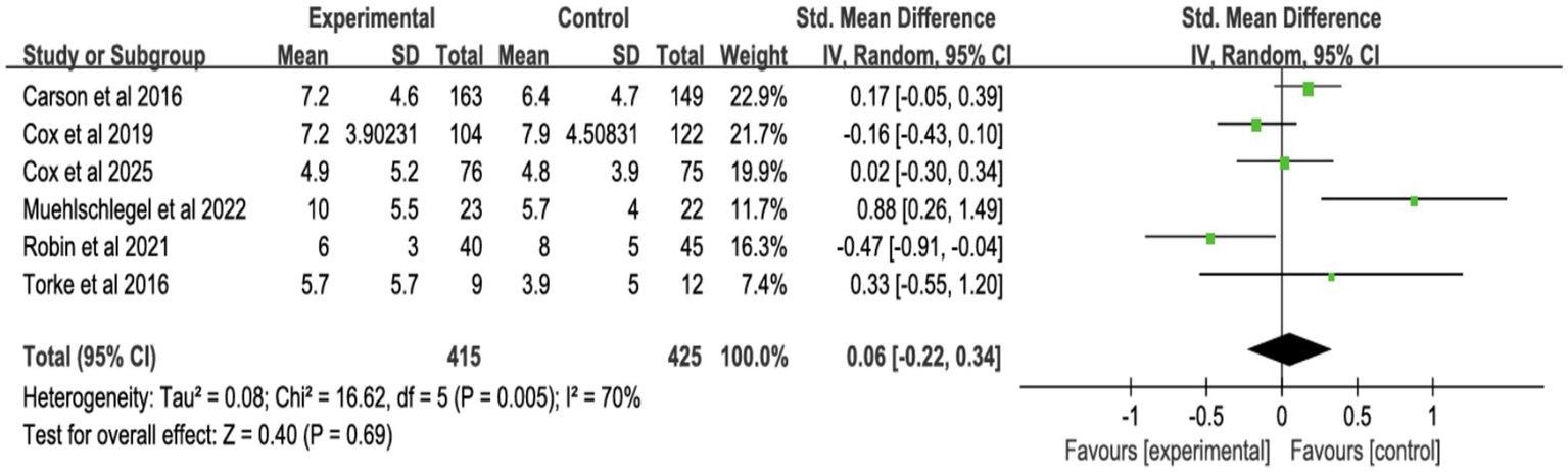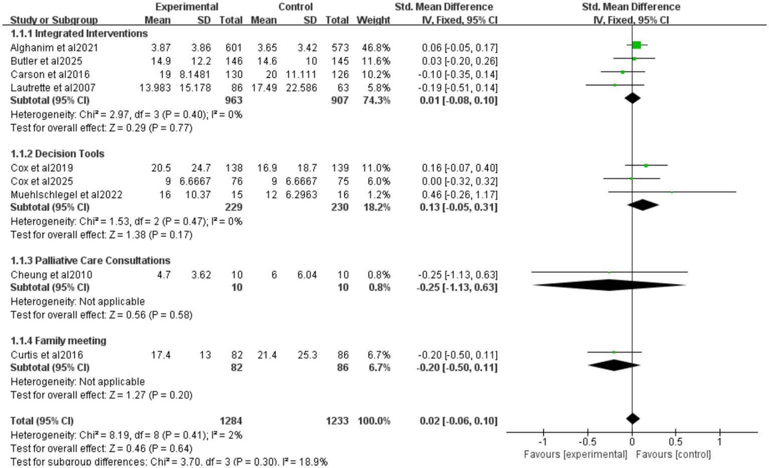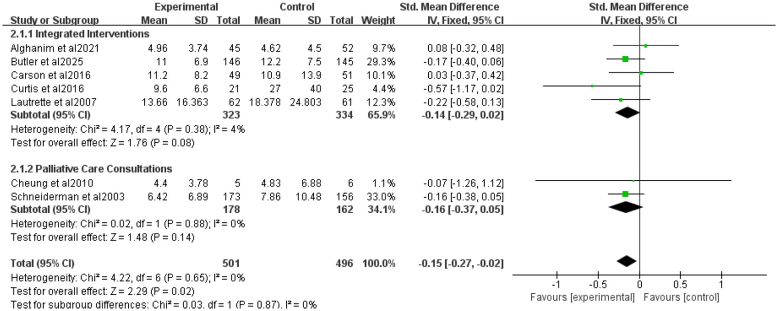 ![Forest plot showing standardized mean differences for various interventions. The plot includes four categories: Integrated Interventions, Decision Tools, Palliative Care Consultations, and Family Meetings. Each subgroup displays individual study results, totals, and confidence intervals. The overall mean difference is 0.02 with a 95% confidence interval of [-0.06, 0.10]. Heterogeneity is low across most categories. The x-axis indicates favor towards experimental or control groups.](https://www.frontiersin.org/files/Articles/1726976/xml-images/fmed-13-1726976-g005.webp)