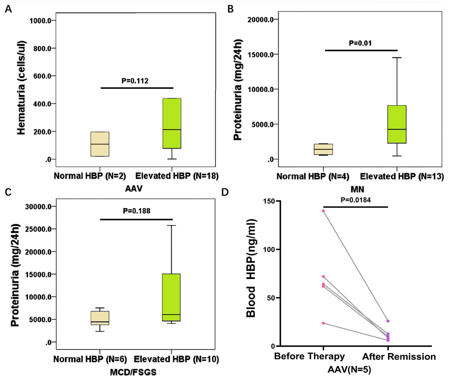 The clinical significance of elevated blood HBP in different kinds of autoimmune kidney diseases. (A) Comparison of hematuria levels between AAV patients with normal blood HBP and elevated blood HBP. (B) Comparison of proteinuria levels between MN patients with normal blood HBP and elevated blood HBP. (C) Comparison of proteinuria levels between MCD/FSGS patients with normal blood HBP and elevated blood HBP. (D) The blood HBP levels of 5 AAV patients with elevated HBP at the onset of the disease significantly decreased after achieving remission.