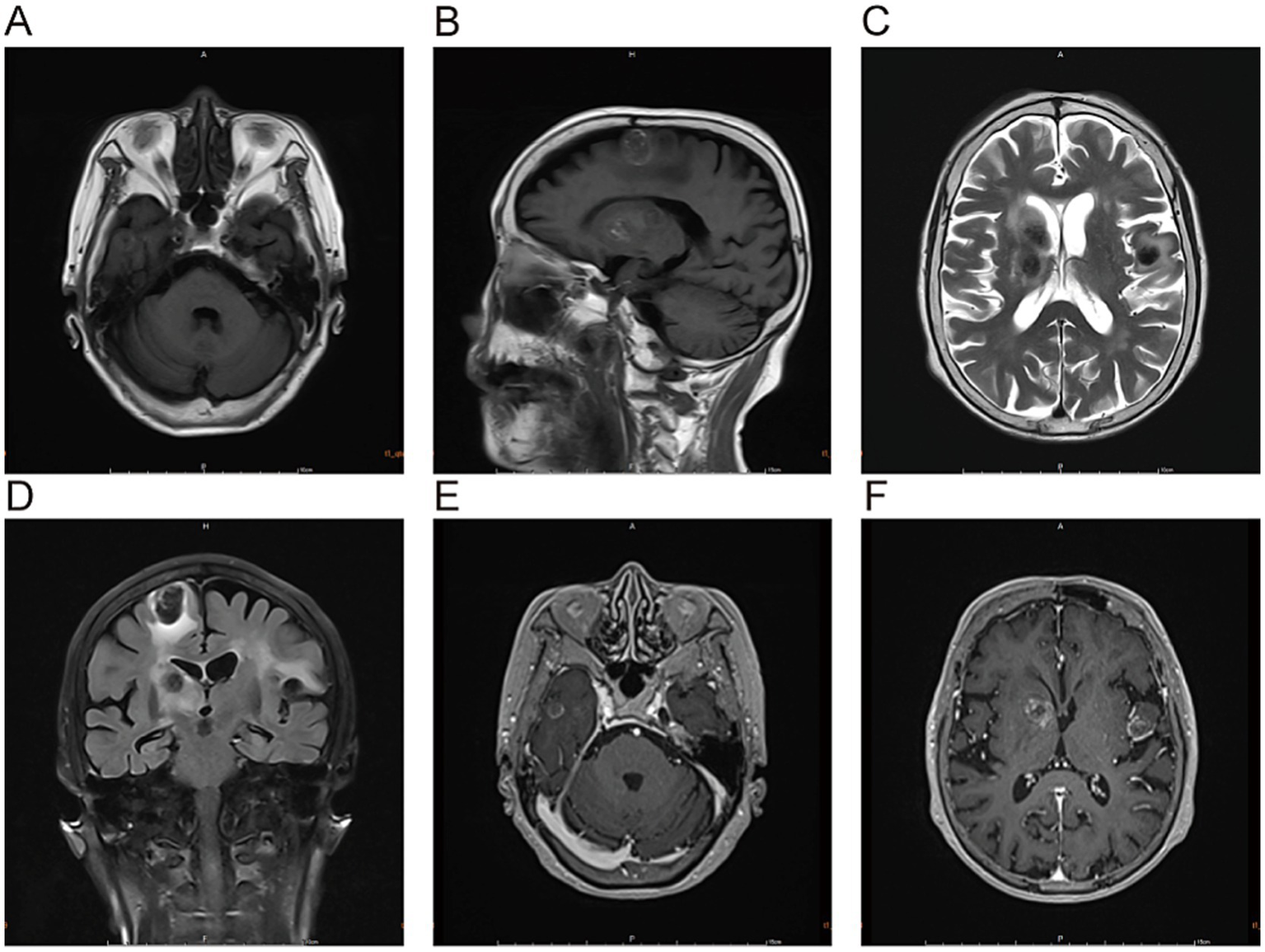 The lesions in the right frontal-temporal lobe and basal ganglia region, as well as the left frontal lobe, predominantly exhibit high signal intensity on T1-weighted images (A,B) and low signal intensity on T2-weighted images (C). T2-FLAIRE sequences (D) reveal patchy perilesional edema surrounding the lesions. Contrast-enhanced scans (E,F) demonstrate ring enhancement.