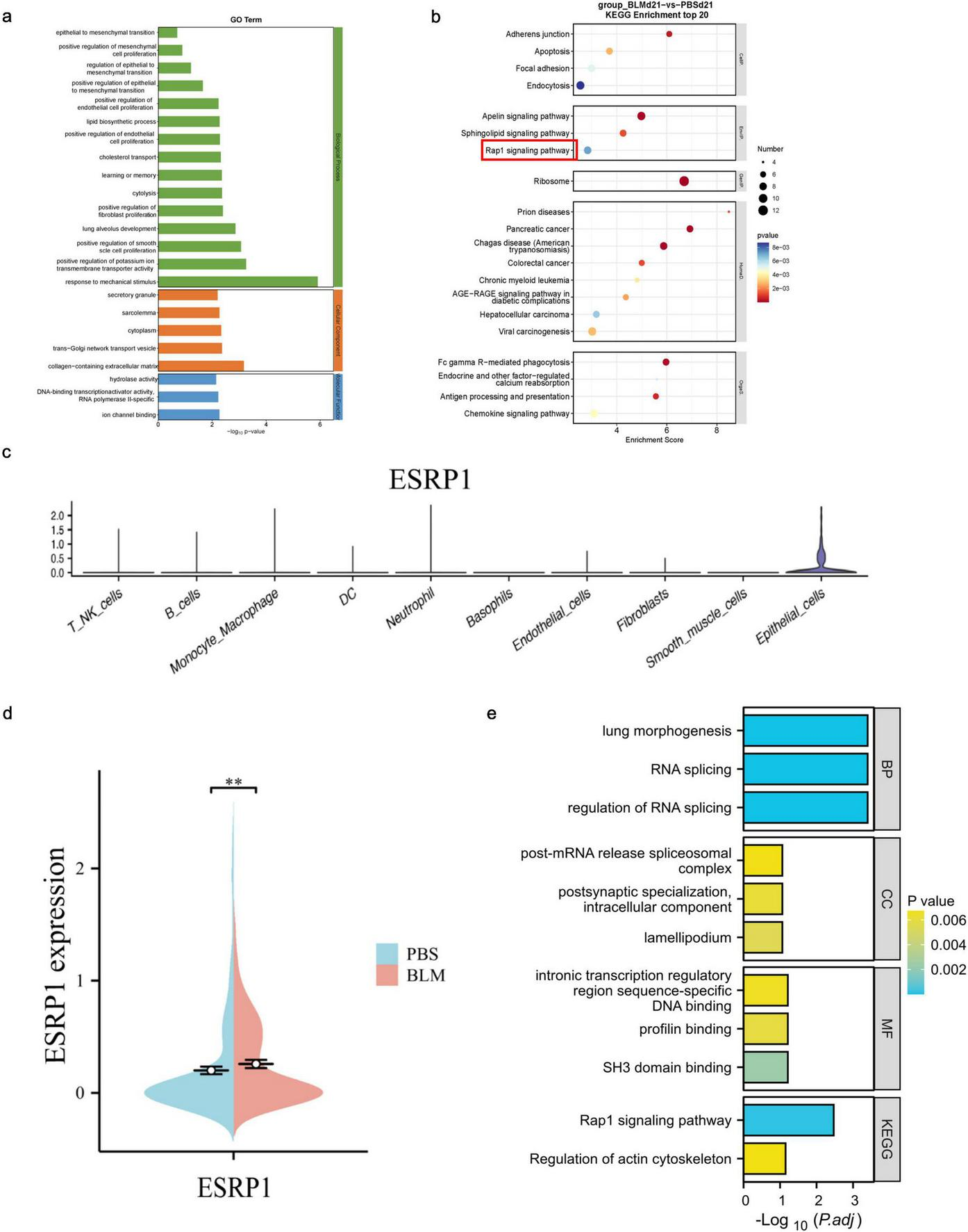 Differential gene expression and functional enrichment of lung epithelial cells in bleomycin-induced pulmonary fibrosis. (a) GO analysis of epithelial cell function. (b) KEGG pathway analysis of all cells. (c) To detect the expression and distribution of ESRP1 in each cell using Loupe software. (d) To detect the difference of ESRP1 in epithelial cells of lung tissue between two groups of mice. (e) Function and pathway analysis of ESRP1 gene with GO and KEGG.