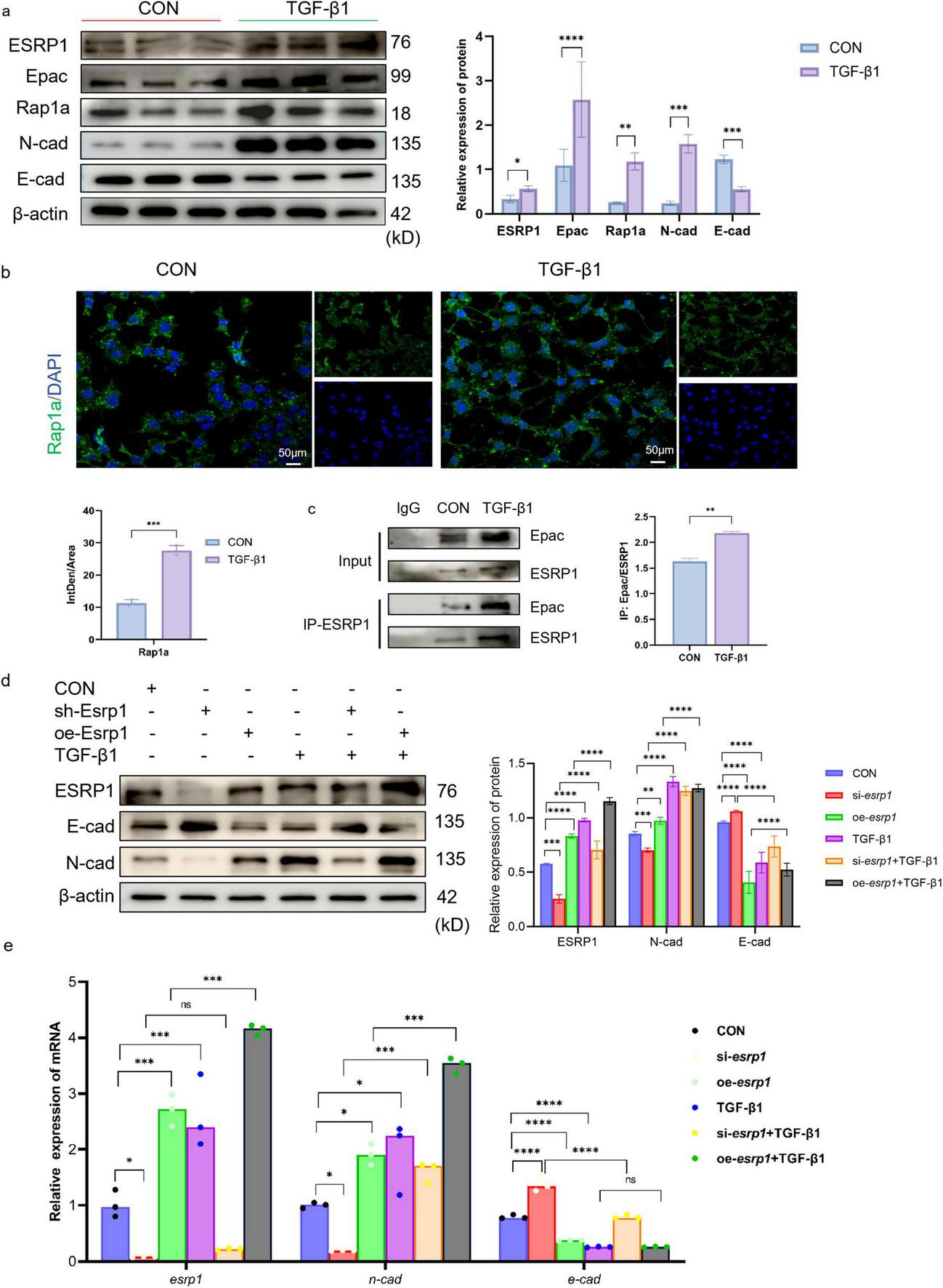 ESRP1 regulates Rap1a to promote EMT in MLE-12 cells. (a) The protein expression levels of ESRP1, Epac, Rap1a, N-cad, and E-cad were measured in MLE-12 cells treated with 10 ng/ml TGF-β1 for 24 h. (b) IF analysis showed Rap1a (green signal) expression in both Control and TGF-β1-treated groups. (c) Co-IP demonstrating the interaction between ESRP1 and Epac in mouse MLE-12 lung epithelial cells. The protein detection results after IP were used for the quantitative analysis of protein-protein interactions. (d,e) Following 48 h of lentiviral exposure, MLE-12 cells were subjected to TGF-β1 stimulation for 24 h, siRNA, lentivirus, siRNA+ TGF-β1 and lentivirus + TGF-β1, the levels of ESRP1, N-cad, and E-cad were determined by qPCR and Western Blot. Quantified by densitometric analysis. The data is expressed as average ± SD. Statistically significant differences are indicated as *P < 0.05, **P < 0.01, ***P < 0.001, and ****P < 0.0001.