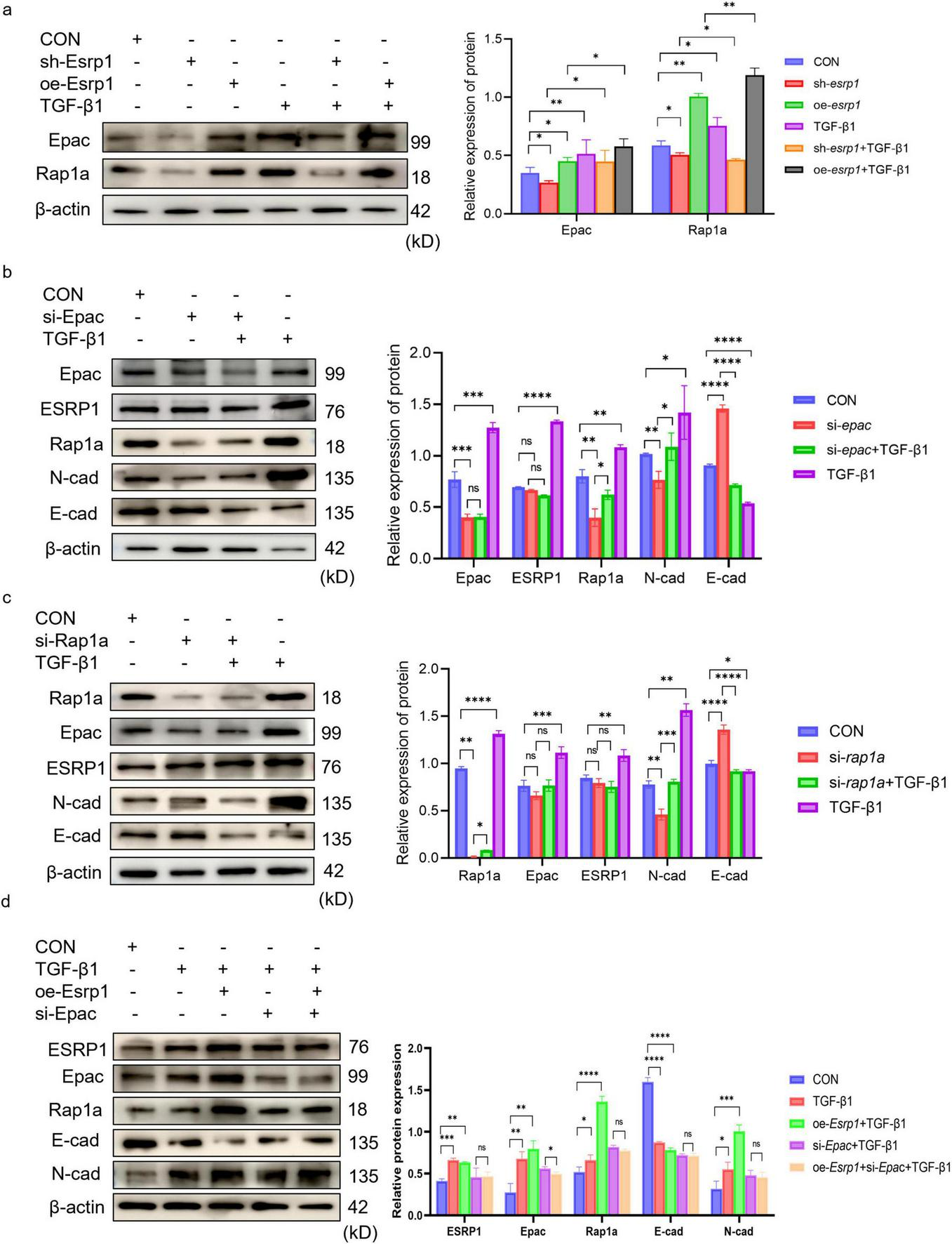 ESRP1 promote EMT via Epac-Rap1a in MLE-12 cells. (a) Lentiviral esrp1 knockdown or overexpression induces parallel changes in Epac and Rap1a. (b) siRNA-mediated epac silencing does not alter ESRP1 but decreases N-cad and increases E-cad. (c) siRNA-mediated rap1a silencing leaves Epac and ESRP1 unchanged while similarly reducing N-cad and elevating E-cad. Bar graphs show mean ± SEM; *P < 0.05, **P < 0.01. ***P < 0.001. ****P < 0.0001. (d) Representative Western blot and quantitative analysis of Rap1a, Epac, ESRP1, E-cad, and N-cad in cells treated with TGF-β1 or without esrp1 overexpression and/or epac silencing.
