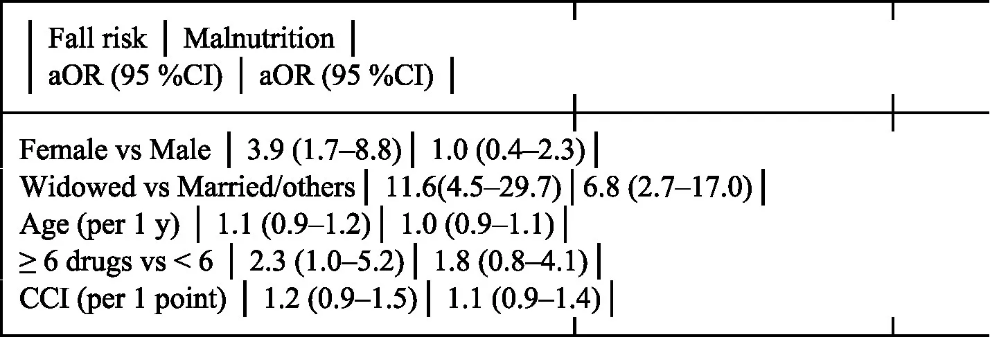 Multivariable logistic regression analysis of factors associated with fall risk and malnutrition.