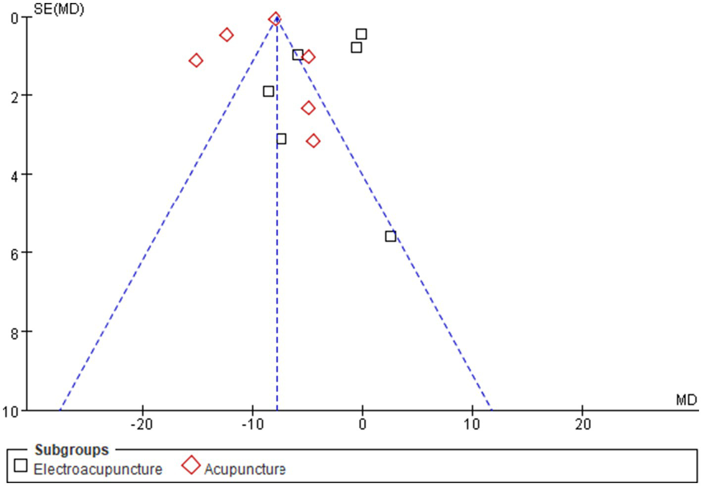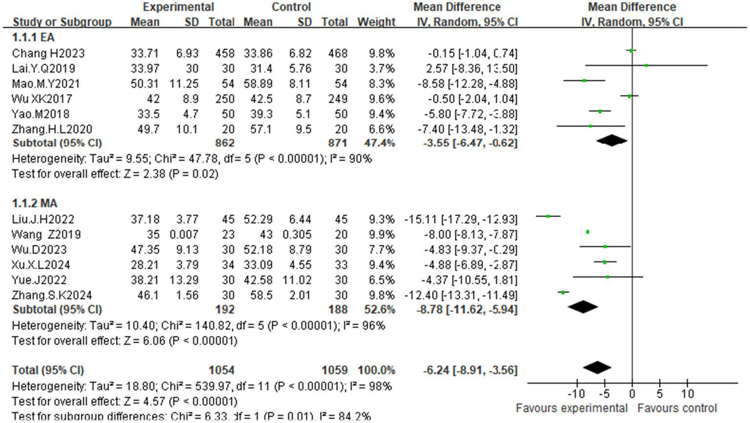 RevMan 5.4.1 software was used for statistical analysis. All outcome data were continuous variables, expressed as the mean difference (MD) with 95% confidence interval (CI). Heterogeneity between studies was assessed via the I2 statistic: I2 ≤ 50% and p ≥ 0.05 indicated low heterogeneity, warranting a fixed-effects model; I2 > 50% or p < 0.05 indicated substantial heterogeneity, warranting a random-effects model. To explore potential sources of heterogeneity, pre-specified subgroup analyses were conducted based on acupuncture modality, treatment duration, and sample size. Sensitivity analysis was performed by sequentially removing each individual study to examine the stability of the pooled results, particularly for outcomes with high heterogeneity. Assessment of publication bias involved visual inspection of funnel plots for asymmetry. For outcomes that included 10 or more studies (i.e., anxiety and depression), Egger’s linear regression test was performed using Stata software 18.0 to quantitatively assess small-study effects. Additionally, acupuncture prescription patterns were analyzed using frequency statistics, and meridian–acupoint networks were visualized with Cytoscape software 3.9.0.