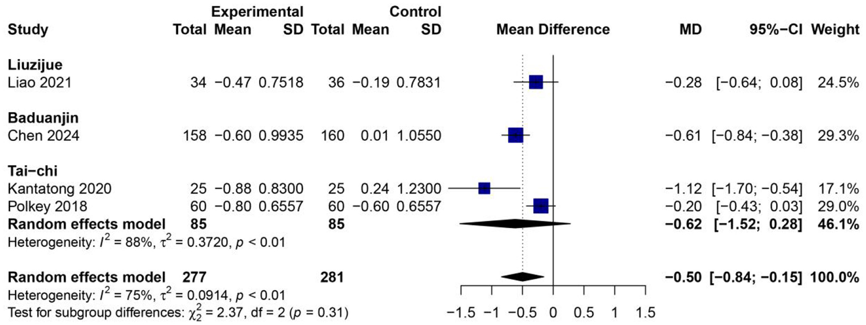 Figure 10 demonstrates that a pooled analysis of four RCTs (25, 26, 29, 34) involving 558 participants (277 in the experimental group and 281 in the control group) indicated that the practice of TCMBEs significantly reduced dyspnea compared to control interventions, resulting in an overall MD of −0.50 [95% CI: −0.84 – −0.15, p < 0.01] using a random-effects model. The variability among studies was moderate (I2 = 75%, p < 0.01), however the analysis for subgroup differences revealed no significant disparity between exercise modalities (χ2 = 2.37, df = 2, p = 0.31). Within the subgroups, Tai Chi demonstrated the most significant enhancement [MD = −0.62 (95% CI: −1.52–0.28)], followed closely by Baduanjin [MD = −0.61 (95% CI: −0.84 – −0.38)] and Liuzijue [MD = −0.28 (95% CI: −0.64–0.08)].