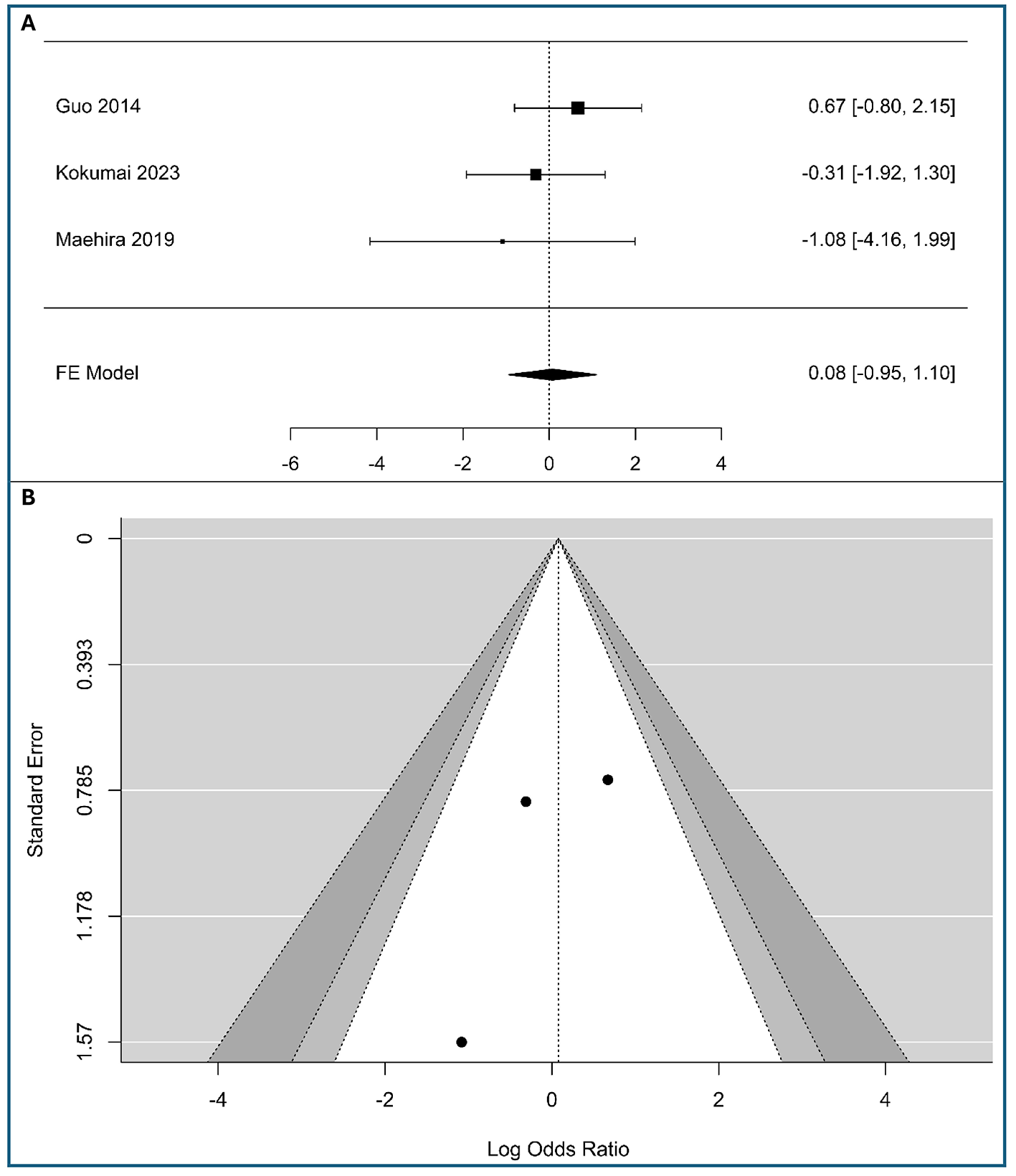 Panel A shows a forest plot with studies: Guo 2014, Kokumai 2023, and Maehira 2019. Squares represent effect estimates, with horizontal lines as confidence intervals. The FE model summary is depicted by a diamond. Panel B is a funnel plot with log odds ratio on the x-axis and standard error on the y-axis, showing scatter points within a triangular region.