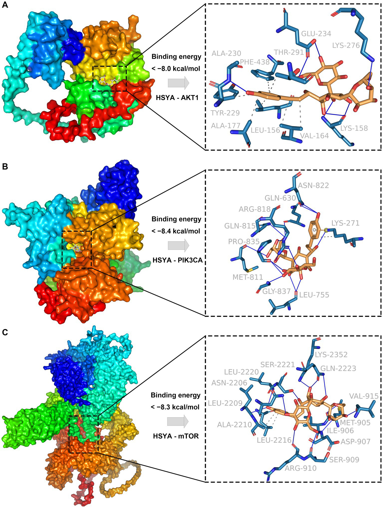 Molecular docking results of HSYA and hub genes. (A) Binding conformation of HSYA and AKT1 protein. (B) Binding conformation of HSYA and PIK3CA protein. (C) Binding conformation of HSYA and mTOR protein. Blue solid lines represent hydrogen bonds, and gray dashed lines represent hydrophobic interactions.