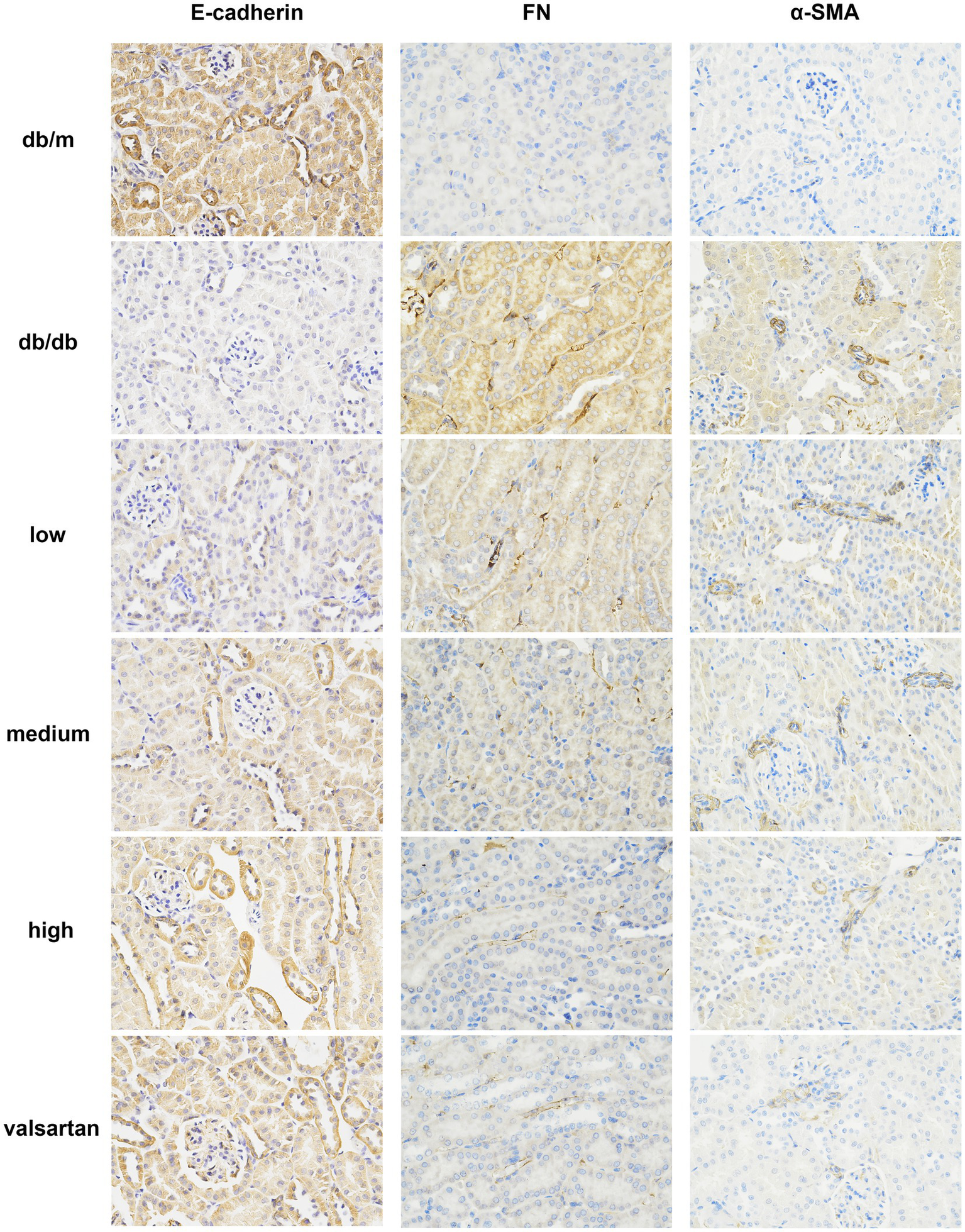 Immunohistochemical staining results of E-cadherin, FN, and α-SMA in the renal tissue from various DN mouse groups (×400). FN, fibronectin; α-SMA, α-smooth muscle actin.