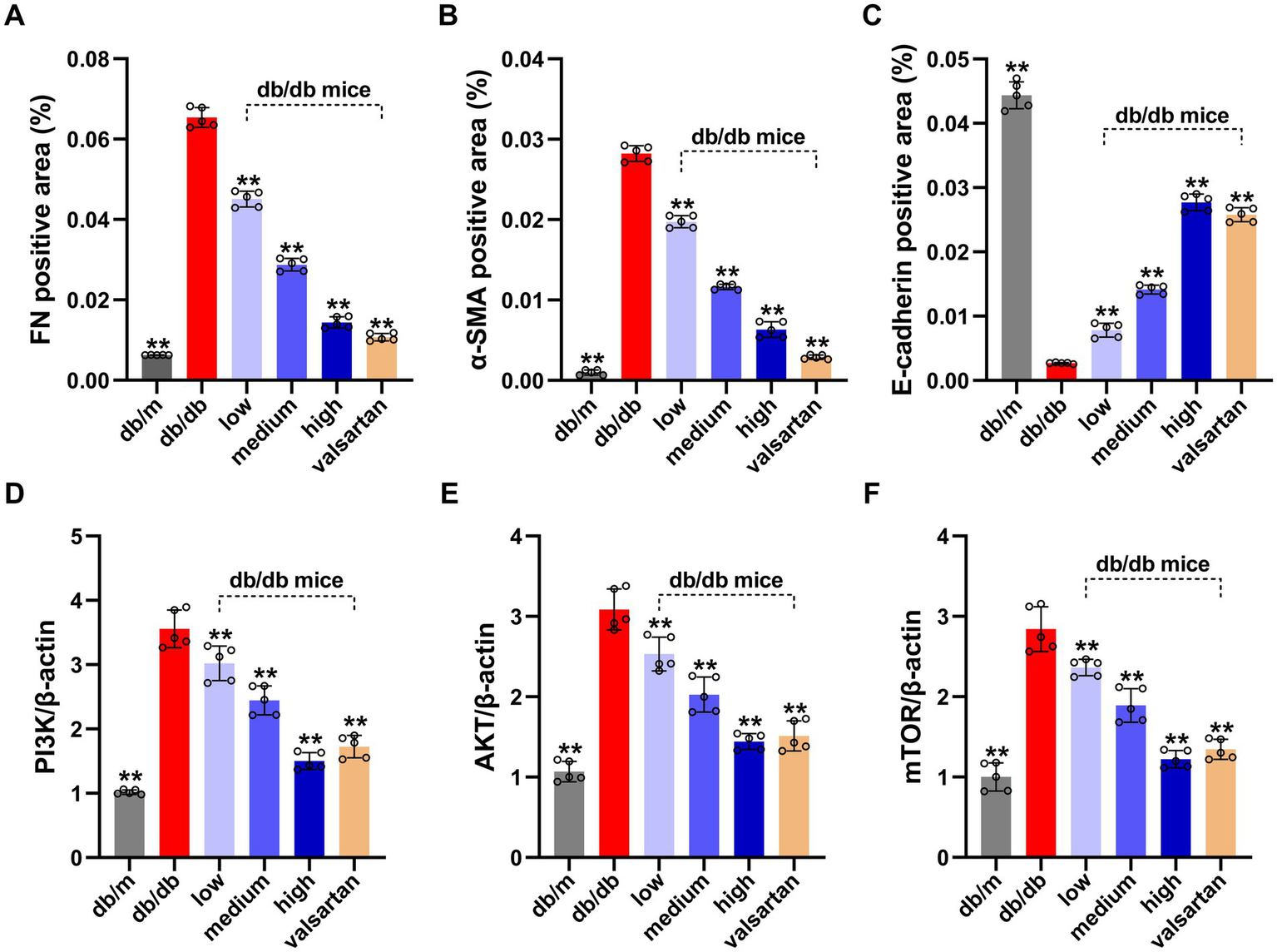 Results of EMT protein levels (quantified by IHC grayscale analysis) and PI3K/AKT/mTOR pathway gene expression (by qPCR) in the renal tissue from various DN mouse groups. (A) FN positive area (%). (B) α-SMA positive area (%). (C) E-cadherin positive area (%). (D) Relative expression of PIK3CA gene. (E) Relative expression of AKT gene. (F) Relative expression of mTOR gene. Data represent means ± SD (n = 5 in each group). *p < 0.05, **p < 0.01 vs. db/db group. IHC, immunohistochemical; FN, fibronectin; α-SMA, α-smooth muscle actin; EMT, epithelial-mesenchymal transition.