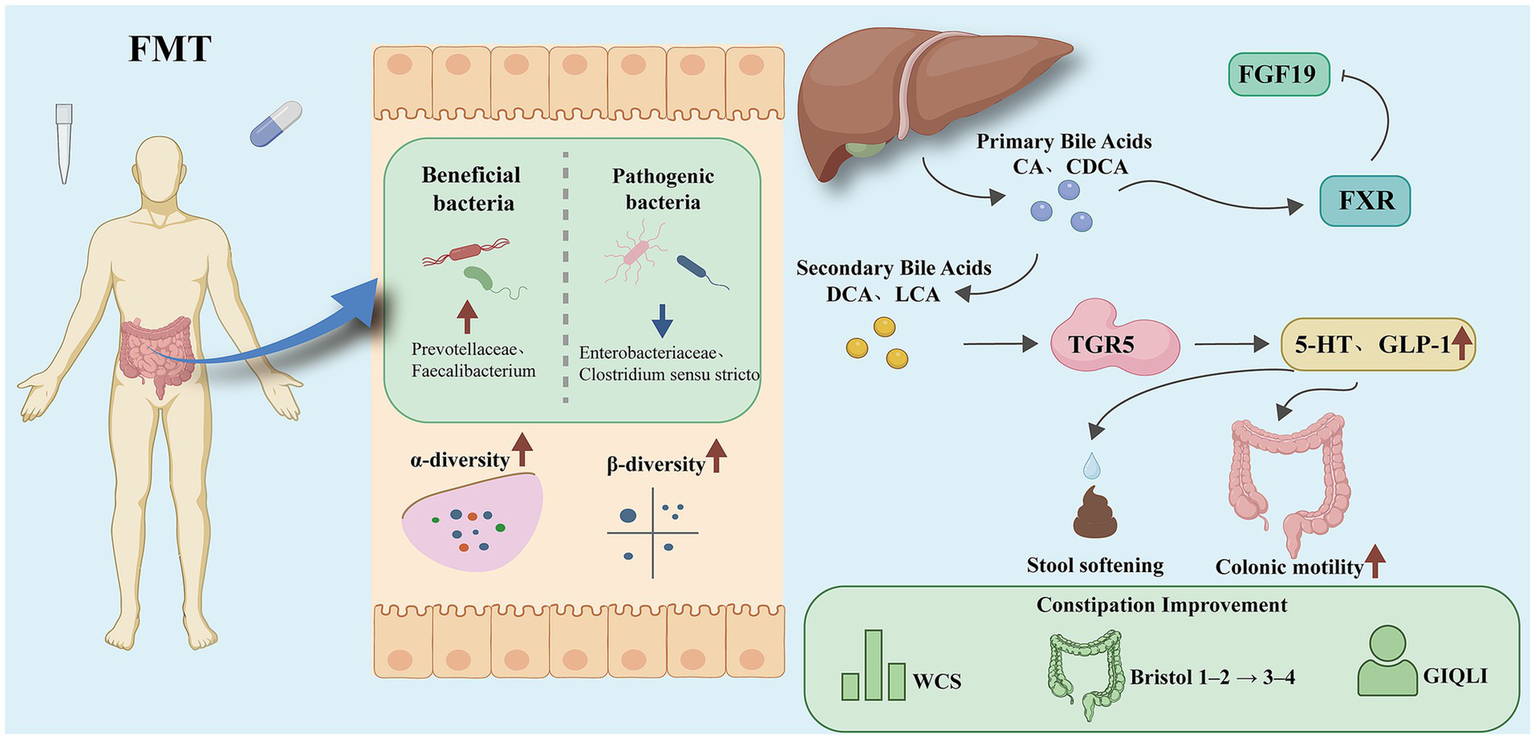 FMT alleviates constipation via the gut microbiota-bile acid-FXR/TGR5-5-HT axis. Overall mechanism framework of Fecal microbiota transplantation (FMT) in functional constipation. FMT reshapes gut microbiota composition by increasing beneficial taxa (e.g., Prevotellaceae, Faecalibacterium) and reducing pathogenic taxa (e.g., Enterobacteriaceae, Clostridium sensu stricto), thereby restoring both α-diversity and β-diversity. Microbial remodeling facilitates bile acid metabolism reconstruction, characterized by reduced primary bile acids [cholic acid (CA), chenodeoxycholic acid (CDCA)] and increased secondary bile acids [deoxycholic acid (DCA), lithocholic acid (LCA)]. These metabolites activate bile acid receptors in distinct regions of the intestine: in the ileum, Farnesoid X Receptor (FXR) induces fibroblast growth factor 19 (FGF19) to maintain bile acid homeostasis, whereas in the colon, Takeda G Protein–Coupled Receptor 5 (TGR5) promotes the secretion of 5-Hydroxytryptamine (5-HT) and Glucagon-like peptide-1 (GLP-1). Through these pathways, stool softening, enhanced colonic motility, and improved bowel habits are achieved, reflected by reduced Wexner constipation scores (WCS), normalized Bristol stool scale (from type 1–2 to type 3–4), and higher gastrointestinal quality of life index (GIQLI).