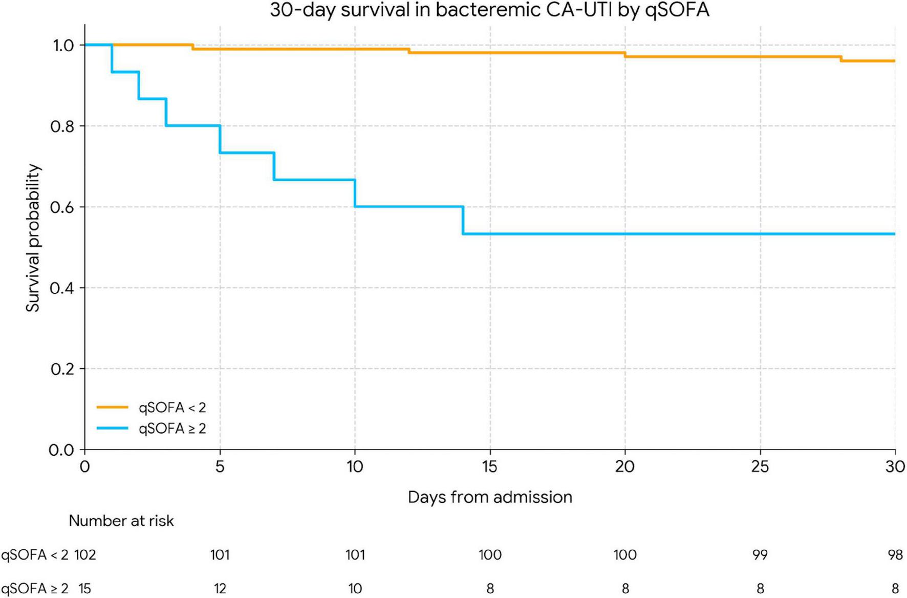 Figure 2. Kaplan–Meier 30-day survival in bacteremic CA-UTI stratified by Qsofa. Kaplan–Meier curves for 30-day survival among adults with bacteremic community-acquired urinary tract infection, stratified by qSOFA at presentation (qSOFA < 2 vs. qSOFA ≥ 2). Survival was significantly worse in patients with qSOFA ≥ 2 (log-rank p < 0.001). The number of patients at risk in each group at selected time points is shown below the x-axis.
