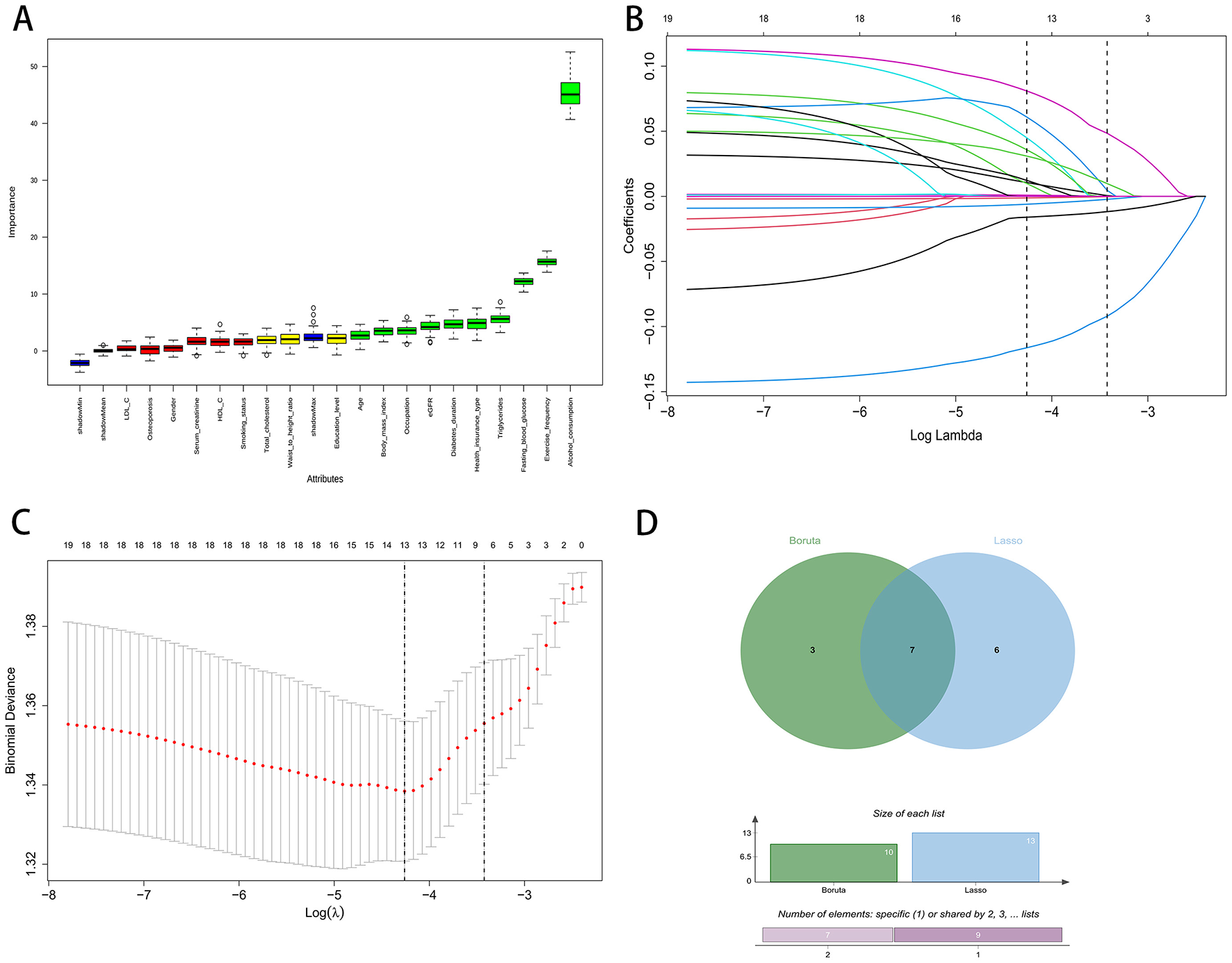 Feature selection process using Boruta and LASSO regression. (A) Boruta variable importance plot. (B) LASSO coefficient paths. (C) LASSO cross-validation curve. (D) Venn diagram of Boruta and LASSO.