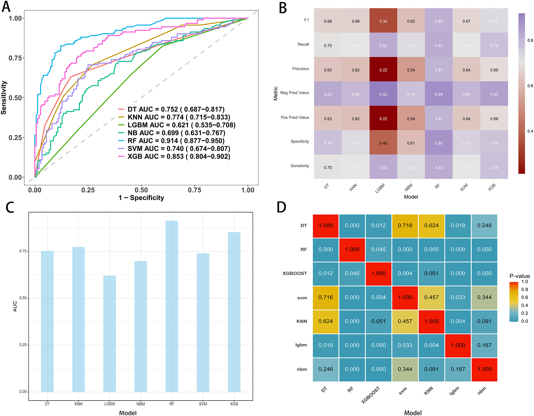 Performance metrics of models in the training cohort. (A) ROC curves and AUC values for the seven model. (B) Comparative analysis metrics across all seven models. (C) AUC display for seven machine learning models. (D) Pairwise AUROC comparisons using the DeLong test; cells show P-values.
