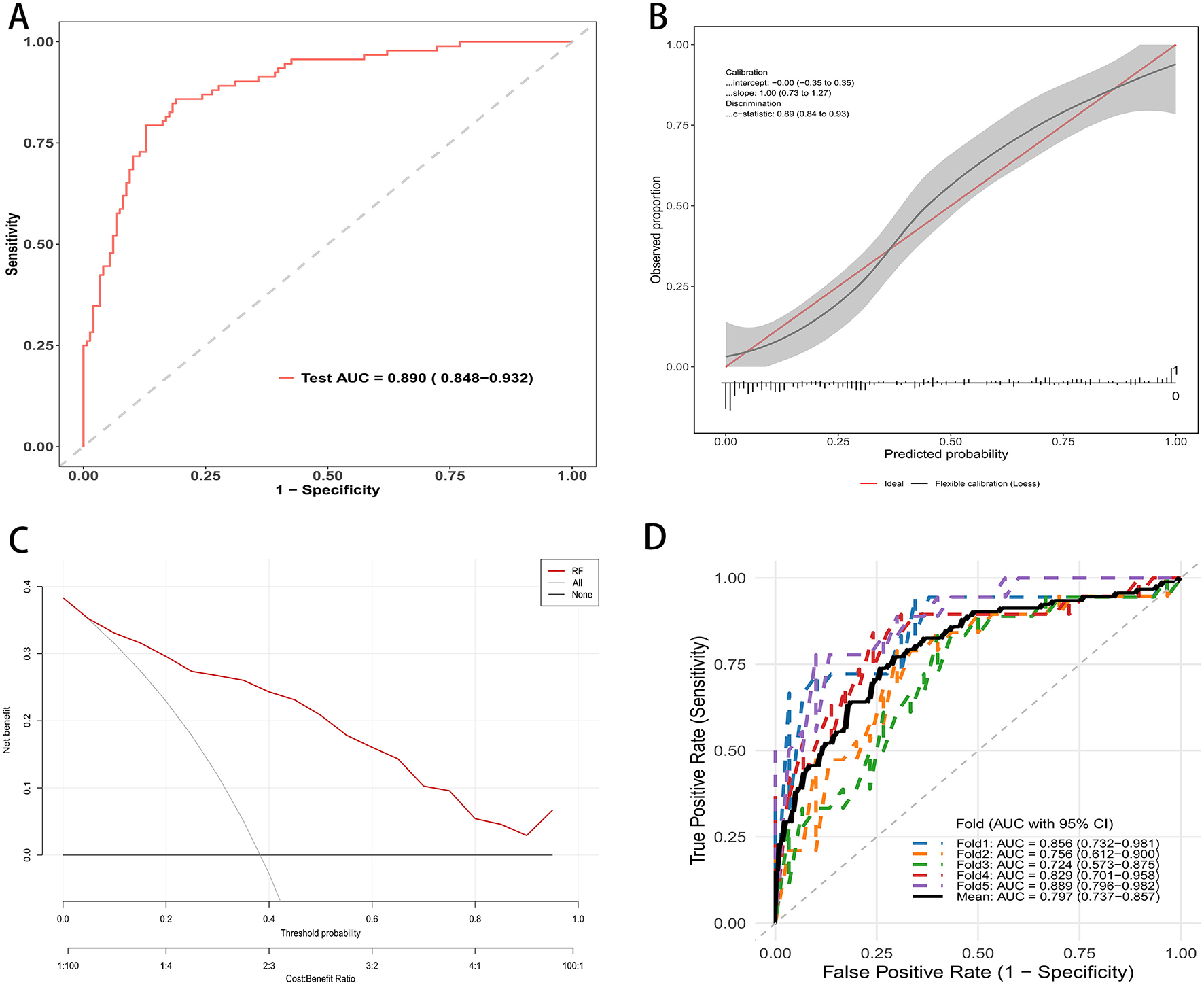 RF mode evaluation in testing cohort. (A) ROC curve on the independent test set; AUC = 0.890 (95% CI: 0.848–0.932). (B) Calibration plot with flexible curve and 95% CI band vs. the ideal line; calibration intercept, slope, and c-statistic are shown. (C) Decision curve analysis: net benefit across threshold probabilities for the random forest (red) compared with treat-all and treat-none strategies. (D) Five-fold cross-validated ROC curves in the testing cohort; colored lines show each fold, the thick black line the mean; legend reports fold-specific AUCs and the mean (95% CI).