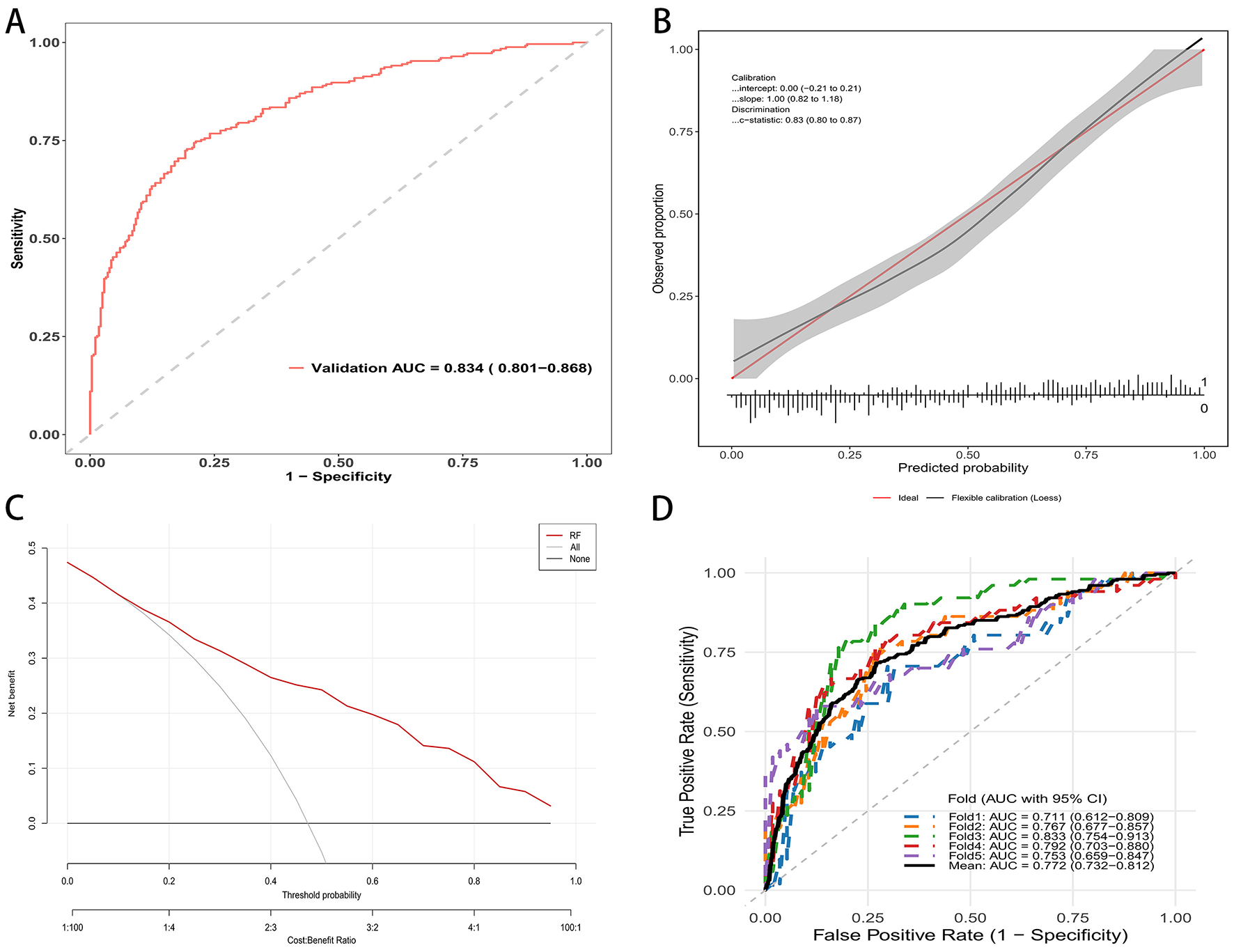 RF mode evaluation in external validation cohort. (A) ROC curve in the validation cohort; AUC = 0.834 (95% CI: 0.801–0.868). (B) Calibration curve of the external validation set. (C) Decision curve analysis: net benefit across threshold probabilities for the model (red) vs. treat-all and treat-none. (D) Five-fold cross-validated ROC curves in the validation cohort.