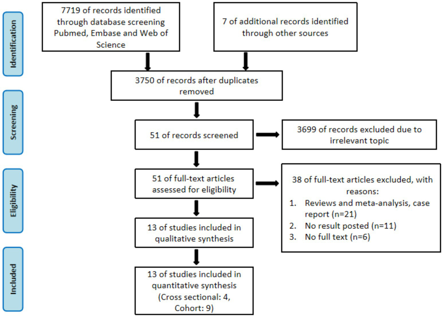 Initially, 7,719 relevant studies were identified, and seven additional studies were supplemented from reference lists. After excluding 3,976 duplicate studies, 3,699 irrelevant studies were excluded through abstract and title screening, leaving 51 studies for full-text assessment. Based on the inclusion and exclusion criteria, 38 studies were excluded, including reviews, meta-analyses, or case reports (n = 21); studies without relevant outcomes (n = 11); and studies without available full text (n = 6). Finally, a total of 13 studies were included in the meta-analysis (23–35) (Figure 1).