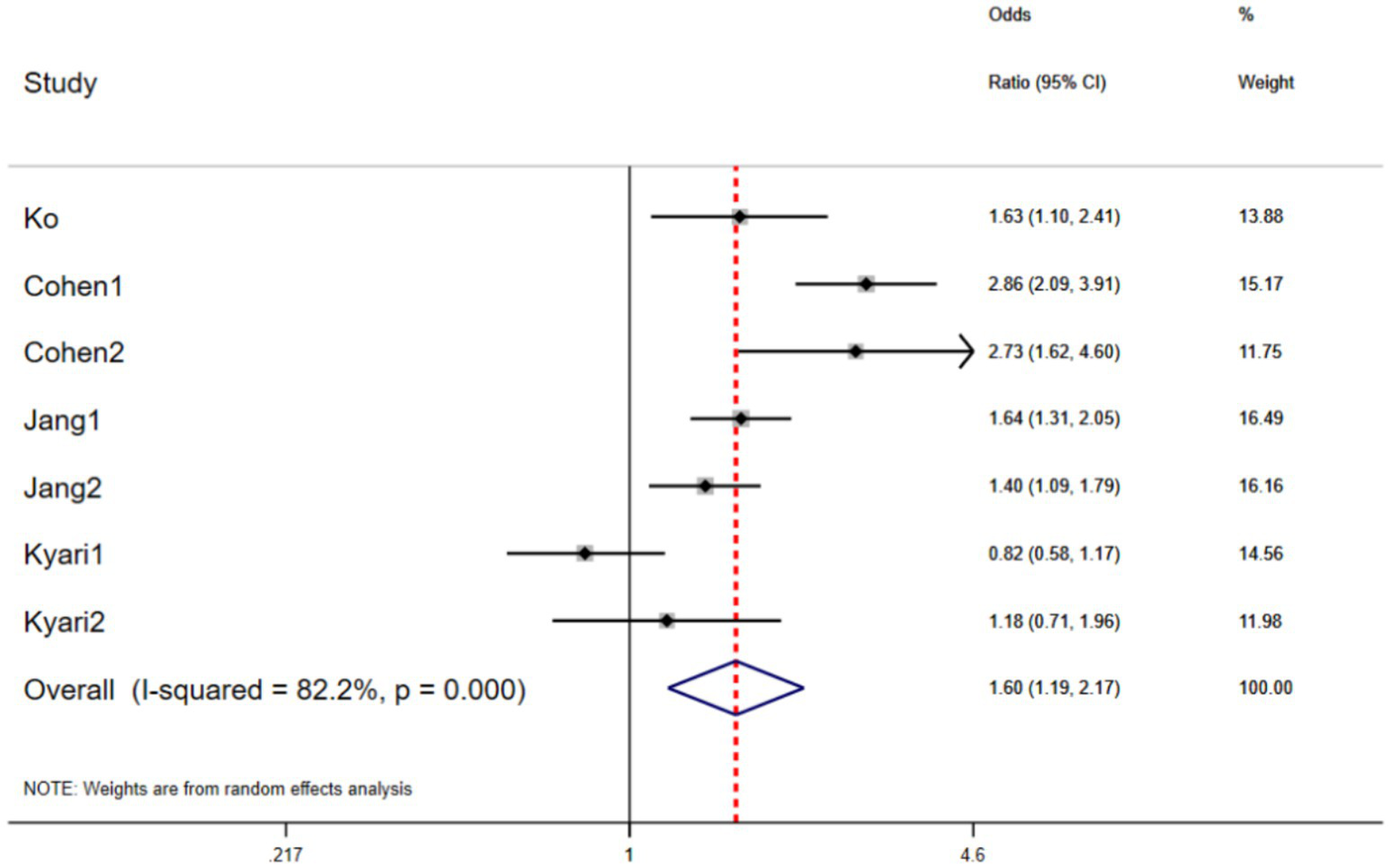 The forest plots of the odds ratio (OR) and 95% CIs for the relationship between obesity and glaucoma (p = 0.002).