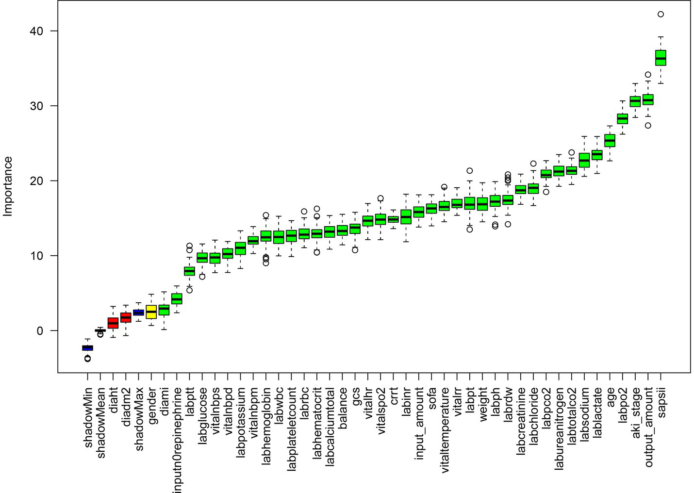 The Boruta algorithm, an effective tool for feature selection and importance ranking, is employed in this study to evaluate candidate variables within the context of a random forest model. The results of this analysis are visually depicted in Figure 1. These findings illustrate a distinct hierarchical distribution of variable importance within the model.