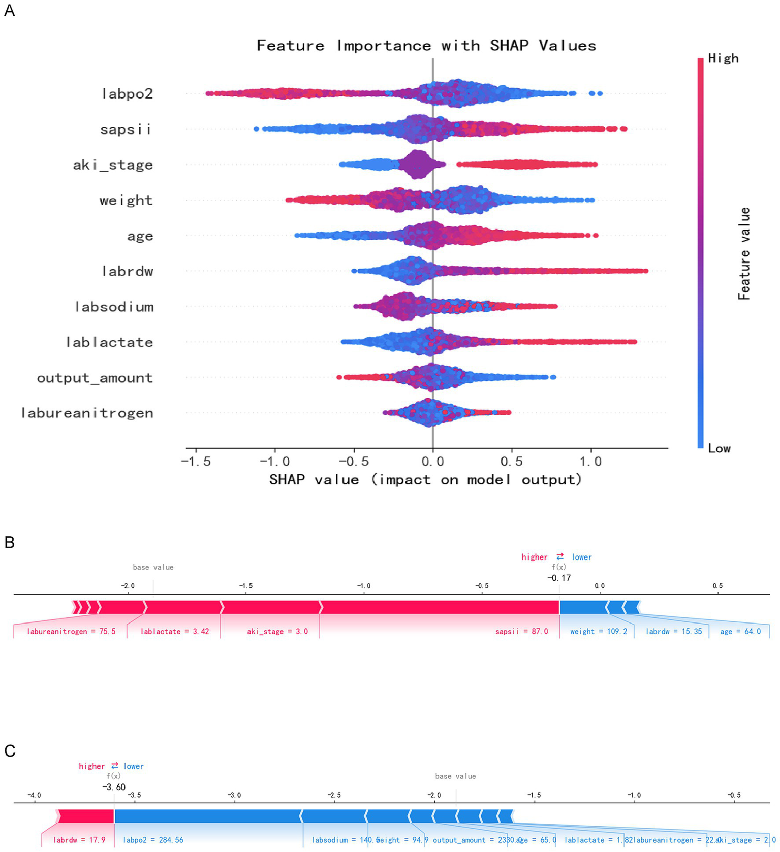 When the Shap value of a variable in the sample exceeds 0, it indicates that the variable positively influences the prediction of the outcome at that moment. To assess how each variable impacts the prognosis of SA-AKI patients during hospitalization, we generated the Shap summary plot and Shap dependency plot for the final prediction model. These visualizations reveal how the positive and negative effects of each variable on outcome prediction fluctuate with its value. Additionally, the Shap maps for the patients were created to illustrate how the model personalizes predictions for each patient’s condition and informs clinical decision-making.