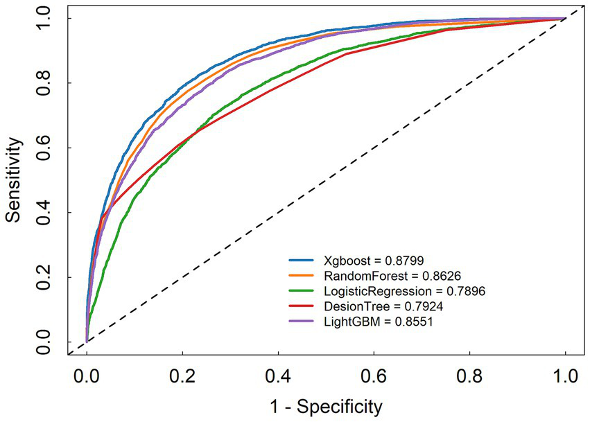 Statistical analysis, modeling, and verification were conducted using Python 3.8 software and associated module packages (19). The training/validation division adopted stratified sampling based on in-hospital mortality outcomes to maintain consistent category ratios. Hyperparameters are completed within the training set through cross-validation, and the validation set is only used for the final evaluation. Normally distributed continuous variables are presented as mean ± standard deviation, while non-normally distributed variables are expressed as median (quartile range). Categorical variables are represented as percentages. In univariate analysis, categorical variables are compared using the Pearson chi-square test or Fisher’s exact test, whereas continuous variables are compared using the Student’s t-test or the Kruskal–Wallis test. A p value of less than 0.05 is deemed statistically significant. Internal validation employed the area under the ROC curve (AUC), accuracy, precision, and F1 score to evaluate the performance of models developed by five machine learning algorithms, with the model demonstrating the best performance selected as the final prediction model. The results of the optimal prediction model are explained using Shapley additive explanation (Shap) (20).