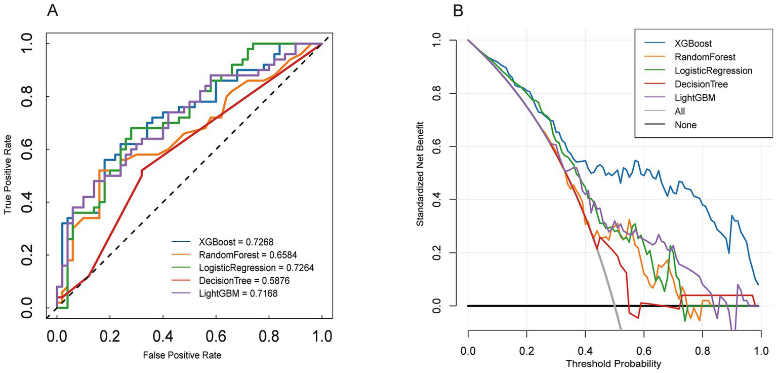 We conducted a retrospective analysis of data from the MIMIC-IV 3.0 database to identify adult ICU patients who met theSepsis-3.0(Sepsis-3 was defined as suspected infection with an acute increase in SOFA score ≥2) and KDIGO criteria for S-AKI. Additionally, a prospective cohort study from the General Hospital of Ningxia Medical University spanning 2023 to 2025 was included. Predictors recorded within 24 h of ICU admission included demographic information, comorbidities, vital signs, laboratory results, treatments, and severity scores. Variables with more than 20% missing data were excluded, and the remaining data were processed using interpolation. Feature selection was performed using the Boruta algorithm, and five machine learning models were trained (XGBoost, Random Forest, LightGBM, Decision tree, logistic regression). Model performance evaluation was based on metrics such as AUC, accuracy, sensitivity, specificity, F1 score, and clinical efficacy assessed through decision curve analysis. To enhance model interpretability, the SHapley Additive exPlanations (SHAP) method was employed.