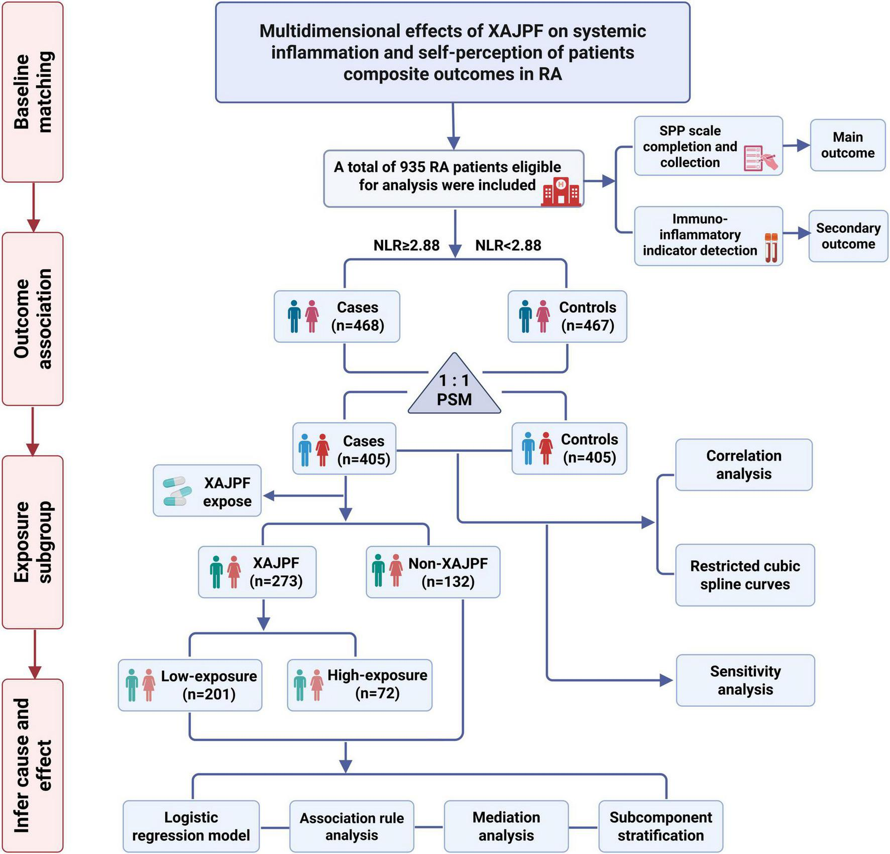 This retrospective cohort study was conducted in the Department of Rheumatology of the First Affiliated Hospital of Anhui University of Chinese Medicine from August 2023 to February 2025. The study used admission and discharge as primary time points, grouping 935 RA patients based on their baseline median neutrophil-to-lymphocyte ratio (NLR) levels and employing propensity score matching to control for intergroup confounders. Exposure was defined as receiving XAJPF treatment (divided into high/low exposure groups based on the type). Multimodal analyses, including logistic regression, association rules, mediation analysis, and sensitivity analysis, were used to comprehensively evaluate the effects of XAJPF on the primary outcomes (SPP scores) and secondary outcomes [NLR and systemic inflammation response index (SIRI)].